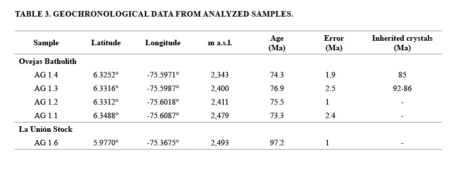 Zircon U-Pb crystallization ages (Table 3) were obtained by the LA-ICP-MS method in five samples (Fig. 6 and 7). One of them corresponds to the La Unión Stock, and four to the Ovejas Batholith. In order to obtain the age of the last crystallization event, the preferred ablation target were crystal borders; nevertheless, some cores were analyzed in order to identify possible inherited ages.