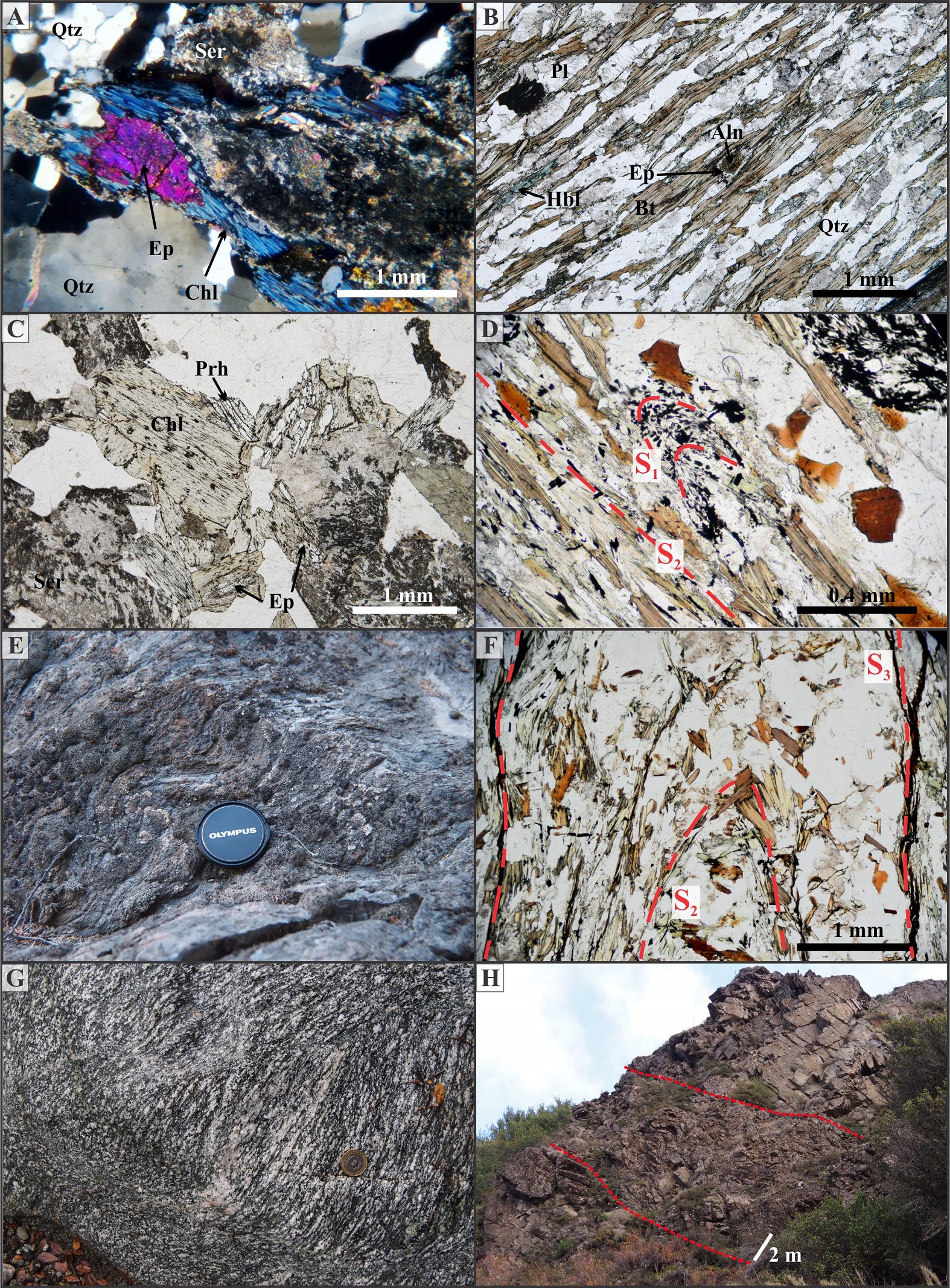 Fig. 4. Field photographs and microphotographs of Devonian granitoids and metamorphic rocks, and structures from San Martin de los Andes area. A. Secondary paragenesis and microstructures in the anatectic granite; B. Microphotograph of the schist from the country rock of the anatectic granite, showing the S2 regional foliation; C. Low-grade metamorphic paragenesis in Devonian granitoids; D. Photomicrograph of a biotite-rich schist with S2 foliation and relict S1 foliation defined mainly by graphite; E. Field photograph of S2 affected by D3 crenulation; F. Photomicrography of folded S2 and incipient S3 crenulation cleavage defined by opaque minerals along pressure-solution bands; G. Discrete centimetric brittle-ductile shear bands affecting Devonian igneous rocks; H. Oblique section of the Alerce river Gondwanan brittle-ductile thrust (Gondwanan shear band), affecting Devonian tonalites near Lago Curruhué Chico (see location in figure 2B). Top block with NE tectonic transport direction. All mineral abreviations according to Siivola and Schmid (2007).