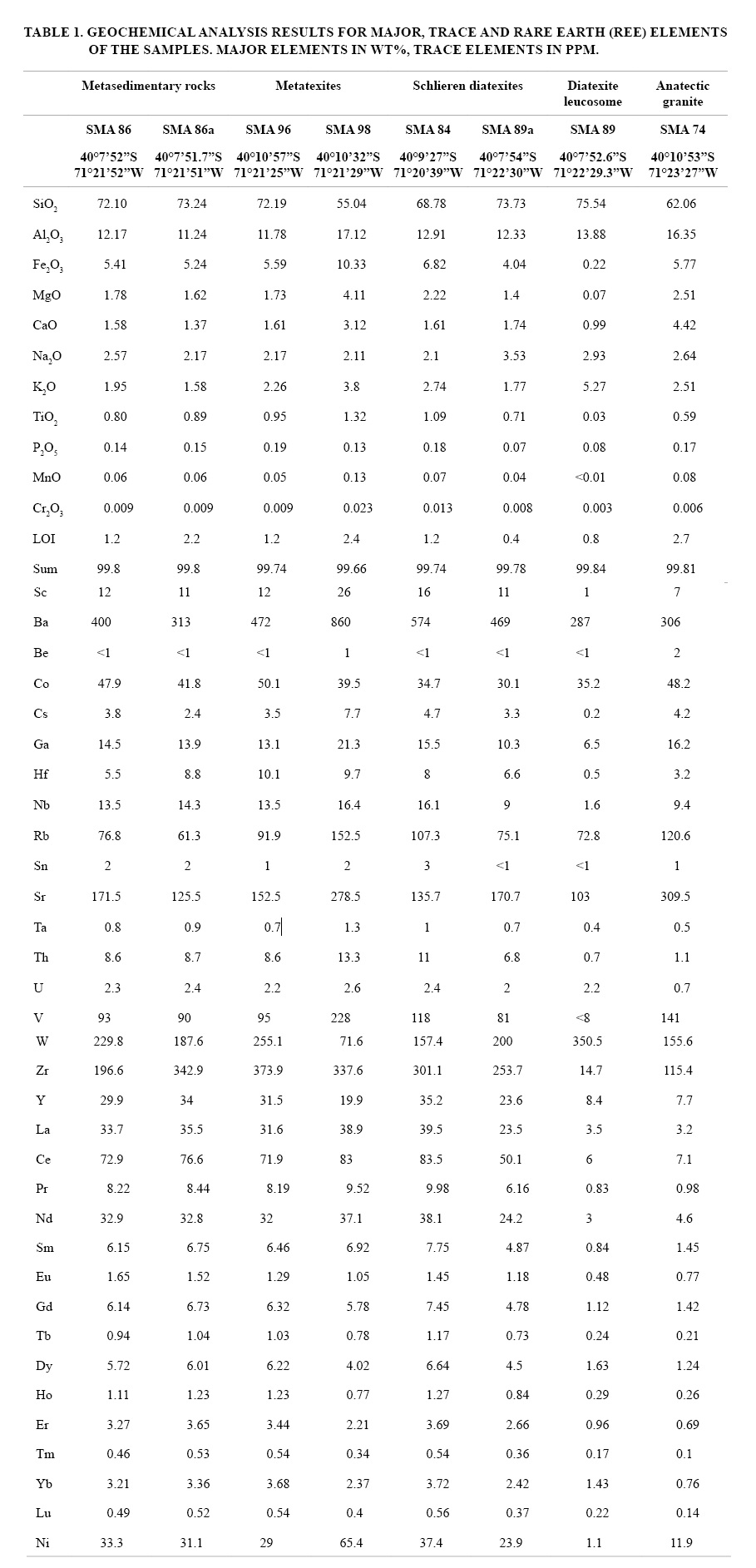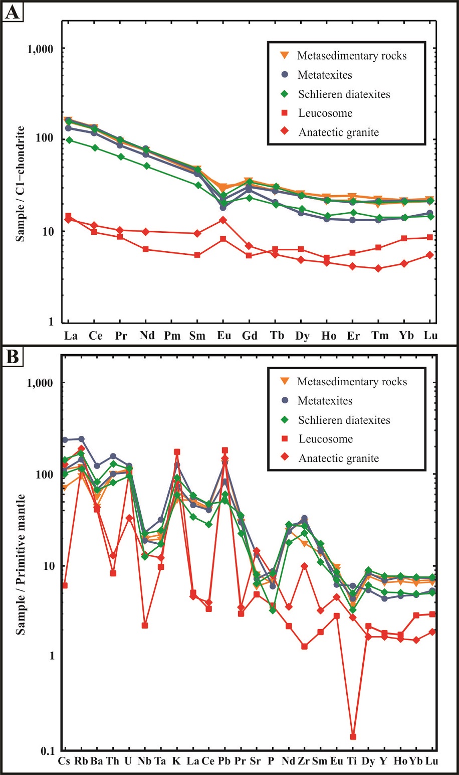 Two groups of samples can be distinguished according to their differences in chemical composition: one group includes metasedimentary rocks, metatexites and diatexites samples, and the other one includes the leucosome and anatectic granite. This last group shows significant differences regarding the first one, being the Sc depletion and the average total REE contents the most remarkable ones. Leucosome and anatectic granite have 8 times lower average REE contents than migmatites and metasedimentary rocks. Moreover, the analyzed leucosome is depleted in Ba and Sr and enriched in Rb, in contrast with the metasedimentary rocks, while the anatectic granite is depleted in Ba and enriched in Rb and Sr.