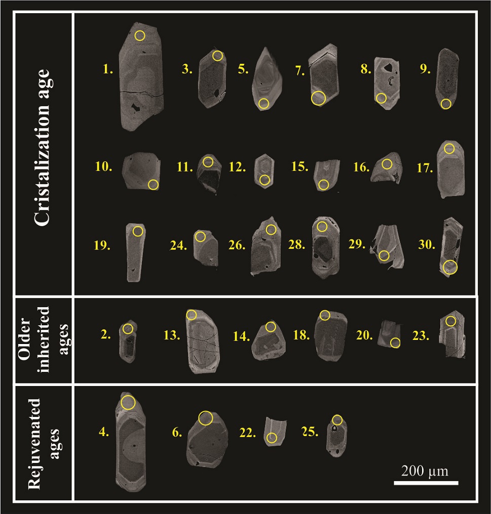 In this section, data from Serra-Varela et al. (2016) will be re-evaluated. On the basis of shape, habit and aspect ratios, different zircon groups were identified (Fig. 7): 1) Prismatic, 130-150 µm zircons with aspect ratios of approximately 2:1; 2) Subrounded, 120-175µm grains with aspect ratios near 2:1; 3) Rounded, 70-130 µm zircons with aspect ratios of 1:1.