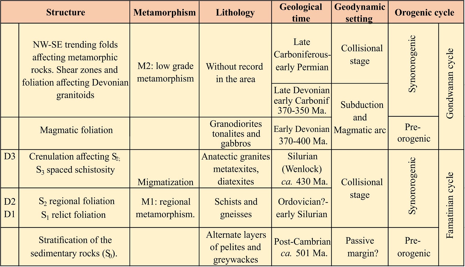 As it was mentioned before, leucosomes of the migmatic rocks are parallel and also cut the regional tectonic foliation of gneisses and schists (interpreted to be an S2). On the other hand, the Devonian granites cut tectonic foliations and migmatitic rocks. These field relations constrain the deformation event between the maximum depositional age of the sedimentary protolith (Cambrian Epoch 3, ca. 501 Ma) and the crystallization of the oldest Devonian granites (Emsian, ca. 400 Ma) (Fig.11).