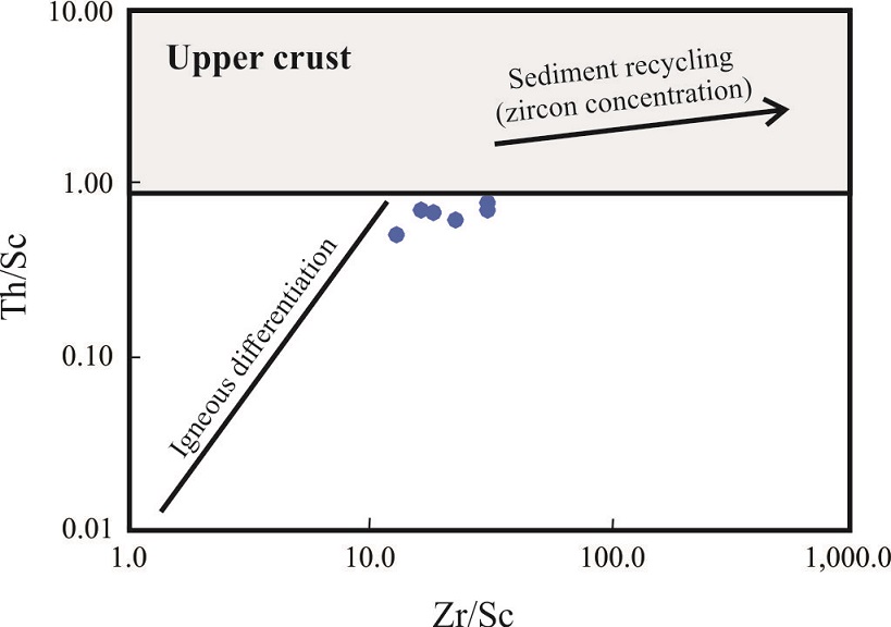 Fig. 12. Th/Sc-Zr/Sc ratio diagram after McLennan et al. (1993). This diagram shows the composition of the sources and the extent of recycling or concentration of Zr in the sedimentary protolith, associated with the abundance of heavy minerals, particularly zircon.