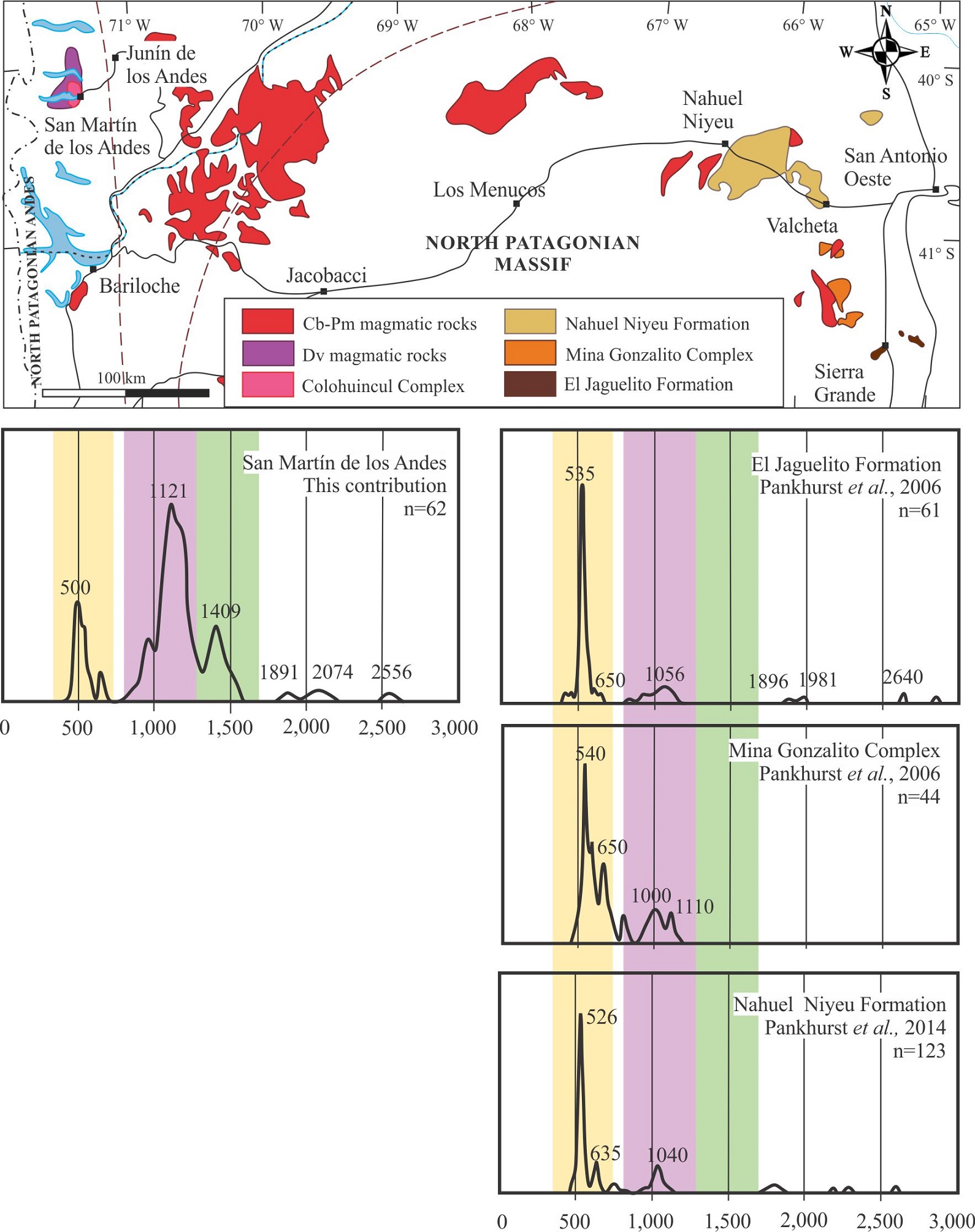 The detrital zircon patterns for the basement of eastern North Patagonian Massif show the youngest peak close to the maximum sedimentation age of the basement units, at approximately 515 Ma (Greco et al., 2015; Pankhurst et al., 2006). This peak reveals the presence of the active magmatic arc of Cambrian and Early Ordovician age. The detrital zircons also indicate older provenances for these units with peaks at ca. 550-650 (Cambrian-late Neoproterozoic) and 1,000-1,200 Ma (late Mesoproterozoic), as well as isolated ages at ca. 2,200 Ma (Greco et al., 2017; Naipauer et al., 2010; Pankhurst et al., 2006, 2014; Rapalini et al., 2013).