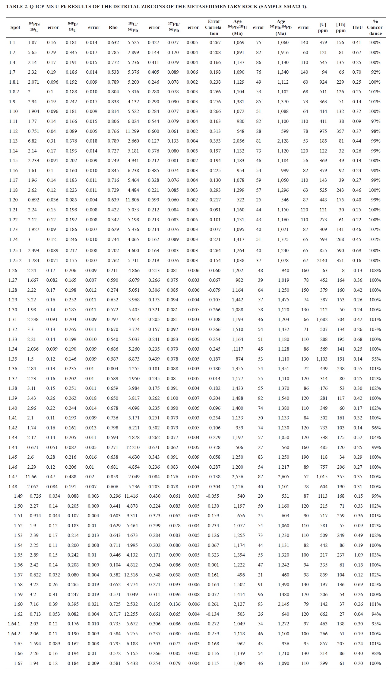 From the total analyzed zircons, eight analyses were discarded based on their discordant ages and for having high common Pb. Sixty-two zircons yielded concordant ages defining three main populations (Fig. 7 and 8): a P1 population (11% of the samples) with ages that range from 656 to 496 Ma; a P2 population (63% of the pattern) with ages between 1,264 and 874 Ma; and a P3 population (19.5% of samples) between 1,510 and 1,299 Ma. There are single analyses of 1,891, 2,056, 2,127 and 2,556 Ma (Fig. 8A). The main population (P2) corresponds to Mesoproterozoic ages where there can be recognized three morphological types of zircons: prismatic, subrounded and rounded. The most representative types of zircons are rounded and correspond to class 4-5 of Gärtner et al. (2013). Meanwhile, prismatic zircons are scarce and can be attributed to classes P1 and P2 of Pupin (1980).