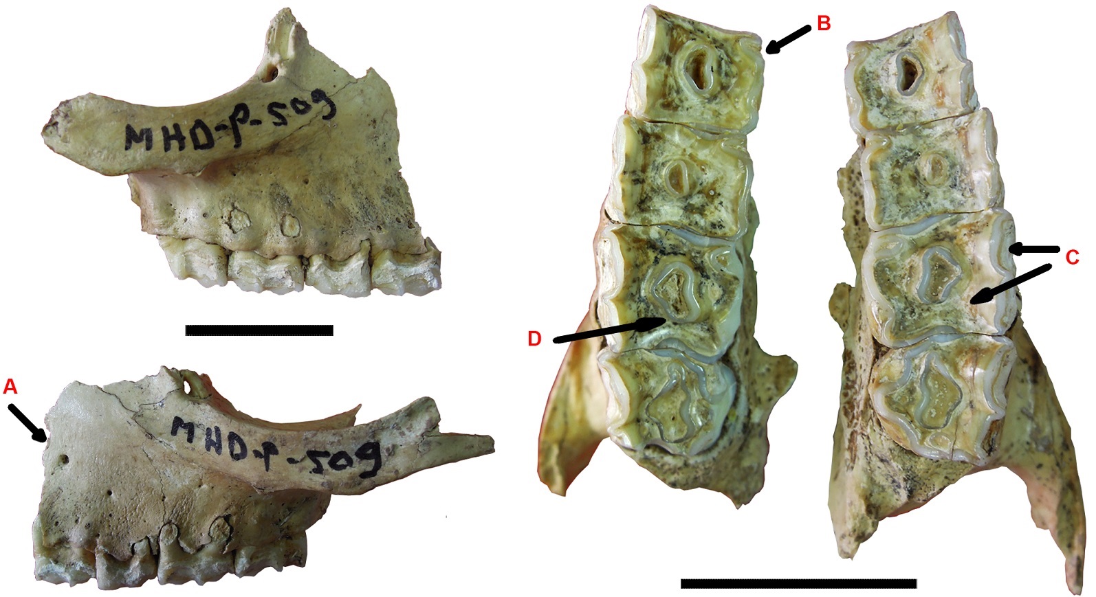Referred specimens. MHD-P 509, a partial right and left cheek dentition (P4-M3) with the jugal portion of the zygomatic arch and a little part of the lacrimal bone preserved (Fig. 3, table 1). MACN-PV 16603b, isolated right M3 with scarce wear (M1-2? sensu Ubilla et al., 2011) (Appendix Fig. 2).