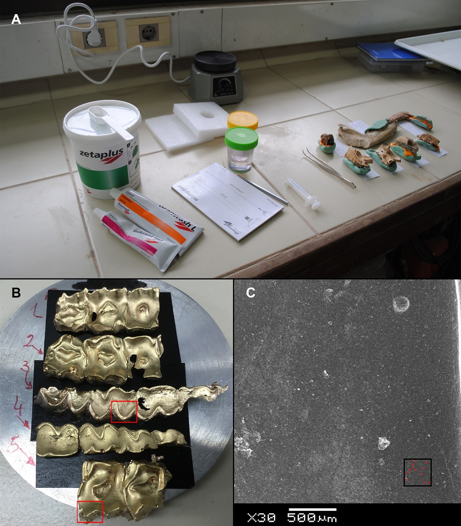 The scars were recorded at the paracone and protoconid (as usually occur in ungulates), and even in the dentine or in the junction dentine-cementum immediately adjacent to that facets (Fig. 1). The teeth were cleaned with a soft brush and etanol, preparing the oclusal surface under stereomicroscopy to ensure the elimination of any kind of glue or sediment particules. In order to preserve the intigrity of the fossils (most of them in a delicate state of conservation), we generated moulds from each piece of interest. The moulds were prepared by double impression (first step: rigid putty; second step: light silicone) with polysiloxane (condensation silicone) impression material and were filled with transparent epoxy resin (60% resin and 40% catalyst) to make the casts (Fig. 1). The cast were prepared on a vibratory plate for eliminate bubbles. The polymerization of the resin was 100% complete after 24 hours. These casts were covered with an ultra thin coating of gold, observed in a Nikon SMZ800 stereomicroscope and photographed at 30X using a Nikon digital sight ds-f1 camera mounted to the stereomicroscopy. Then, the photographs were treated in the computer: a square of 300 µm x 300 µm (0.09 mm2) was defined for quantification, and it was replicate in two different regions of the facets and the mean number was recorded.