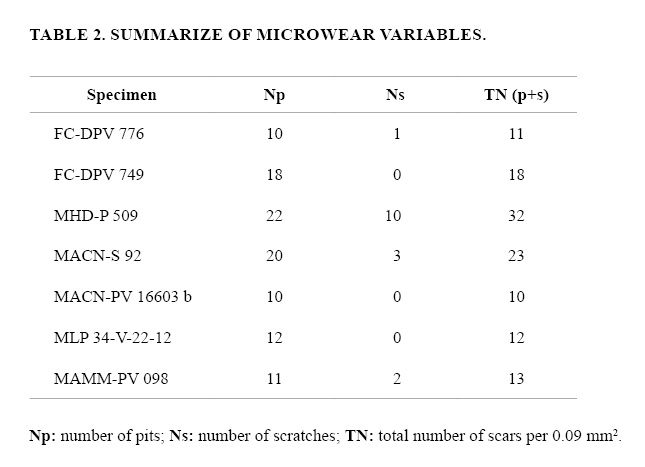 All the specimens here analyzed belong to the same biological entity but, even that, one of them (MHD-P 509) shows a coherent pattern of some deep pits and fine scratches on both right and left molars. This pattern matches with the evidence provided by the results of carbon and oxygen isotopic studies (Morosi and Ubilla, 2017) indicating a proportion of C3 plants consumption for the specimen MHD-P 509 lower than the other individuals of N. recens.
