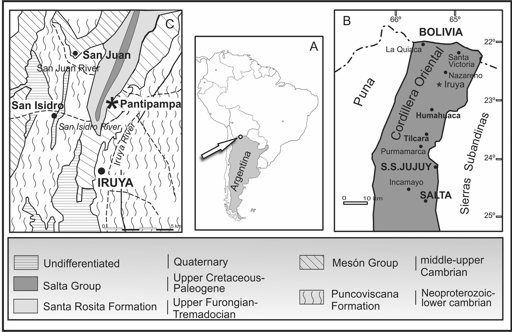 Fig. 1. Location map (A and B) and geologic framework of the Iruya area, northwestern Argentina (C), with the location (asterisk) of the Pantipampa locality (after Figueroa Caprini, 1955; Vilela, 1960; Turner, 1964; Astini, 2003). The Santa Rosita Formation is in ligth gray (Modified from Tortello and Esteban, 2016).