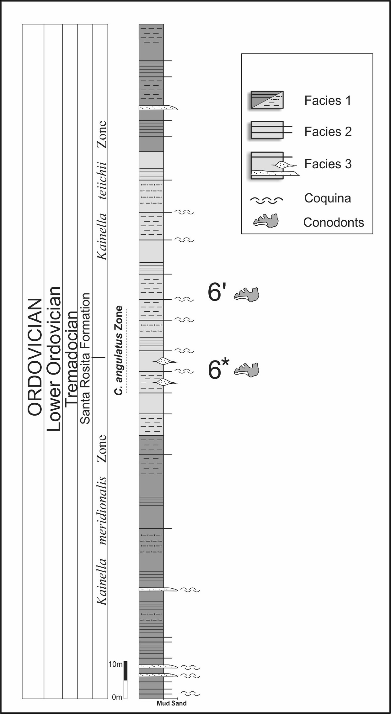 In addition, this zone has been reported from several localities of the Argentinian Cordillera Oriental (e.g., see compilations of Albanesi and Ortega, 2016; Ortega and Albanesi, 2005; Zeballo and Albanesi, 2007, 2013; Albanesi et al., 2008; Zeballo et al., 2008). Conodont assemblages are relatively diverse and comprise a high percentage of endemic species such as Acanthodus raqueli, Kallidontus gondwanicus and Variabiloconus crassus (Zeballo and Albanesi, 2007, 2013). Well-constrained sections of the Santa Rosita Formation and equivalents include Sierra de Cajas (Hünicken et al., 1985; Rao and Hünicken, 1995; Rao, 1999; Albanesi et al., 2015), El Perchel area (Zeballo et al., 2011), Alfarcito (Zeballo et al., 2005; Zeballo and Albanesi, 2013), Angosto del Moreno (Moya and Albanesi, 2000; Moya et al., 2003), Angosto de La Quesera (Carlorosi et al., 2011) and the Incamayo area (Rao and Tortello, 1998; Tortello and Rao, 2000). Besides, the C. angulatus Zone also occurs in the Famatina Range (Volcancito Formation) (Albanesi et al., 1999) and the Precordillera of San Juan (La Silla Formation) (Lehnert, 1995).