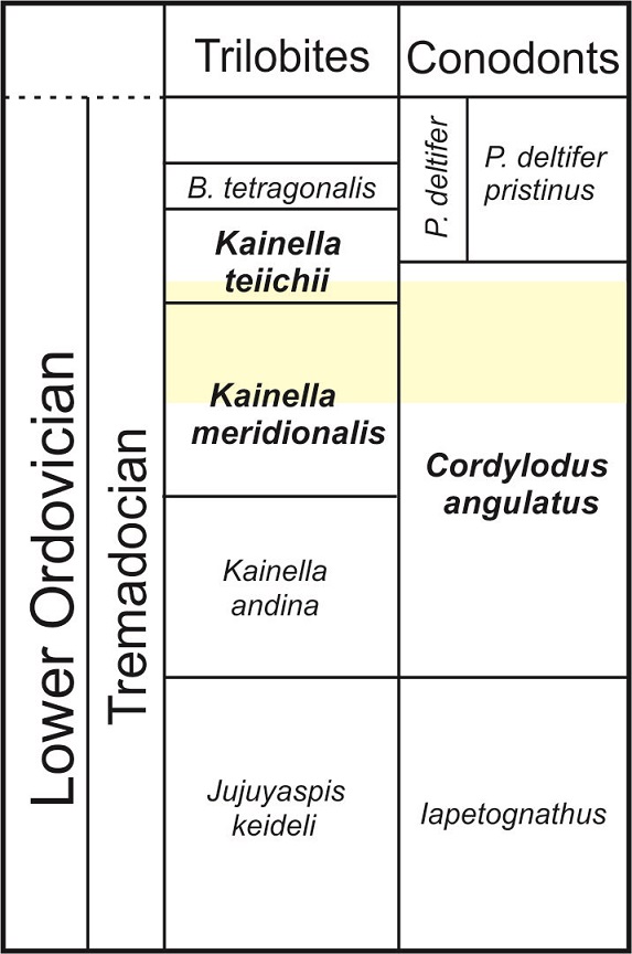 Conodonts from the Santa Rosita Formation of Pantipampa include Cordylodus angulatus, C. caseyi, C. lindstromi, C. hastatus, Furnishina furnishi, Kallidontus gondwanicus, Phakelodus elongatus, Phakelodus tenuis, Proconodontus muelleri, Semiacontiodus sp. and Teridontus nakamurai. Although this fauna is low-diverse, Cordylodus angulatus is a biostratigraphically important species that characterizes the upper lower Tremadocian eponymous zone. Cordylodus angulatus has been reported from both the Atlantic and the Midcontinent Realm (e.g., Ji and Barnes, 1994; Löfgren, 1997). The geographic distribution of the C. angulatus Zone is truly wide, including Mexico (Robison and Pantoja-Alor, 1968; Repetski, 1982), USA (Orndoff, 1988; Harris et al., 1995), Canada (Nowlan, 1985; Bagnoli et al., 1987; Ji and Barnes, 1994), Russia (Pander, 1856), Sweden (Lindström, 1971; Van Wamel, 1974; Löfgren, 1996), Australia (Druce and Jones, 1971; Nicoll, 1990), Iran (Müller, 1973) and China (An, 1987).