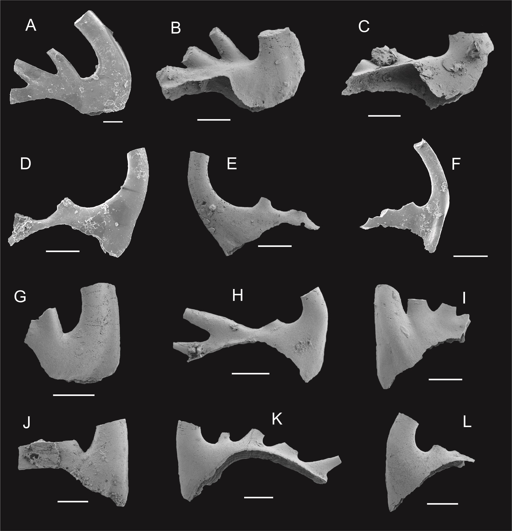Fig. 4. Species of Cordylodus recovered from the Pantipampa locality, Iruya area, northwestern Argentina. A-G. Cordylodus angulatus Pander; A. Pa element, lateral view, CML-C 2000 (1); B-C. Pb elements, inner lateral views, CML-C 2001 (1-2); D-E. Sa elements, lateral views, CML-C 2002 (1-2); F. Sb element, inner lateral view, CML-C 2003 (1); G. fragment of Sc element, lateral view, CML-C 2018 (1). H. Cordylodus caseyi Druce and Jones, Sd element, lateral view, CML-C 2017 (1). I. Cordylodus lindstromi Druce and Jones, Sc element, lateral view, CML-C 2004 (1). J. fragment of Cordylodus hastatus Barnes, lateral view, CML-C 2004 (1). K-L. Cordylodus sp., lateral views, CML- C 2019 (1-2). Scale bars=100 µm.