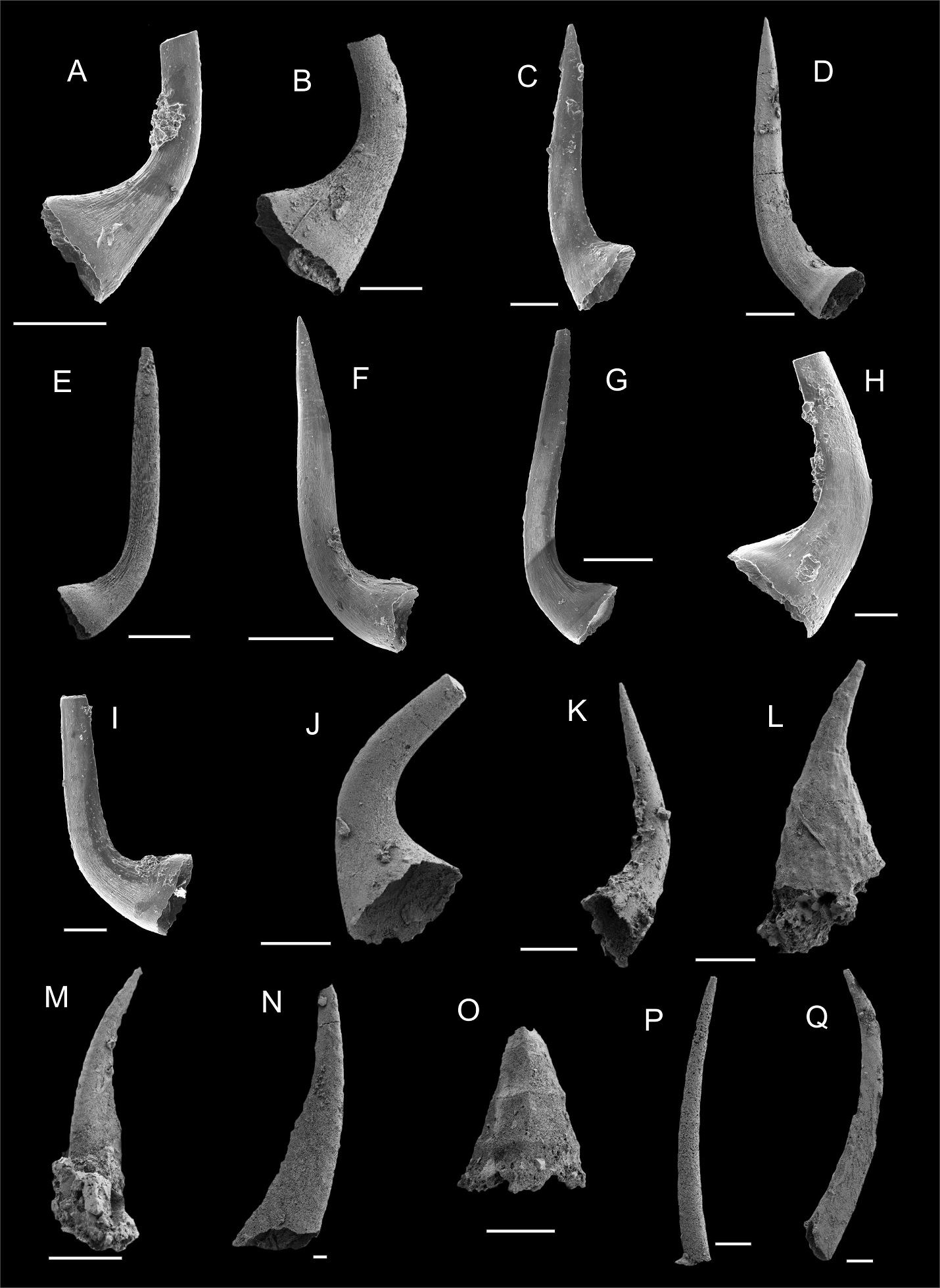 Description. Element long and thin, flattened laterally. Inner and outer sides rounded. Cross section a short distance of cuspide rounded. Basal cavity deep. Elements with a smooth outer surface or with oblique ribs that form a fishbone structure on the posterior side.