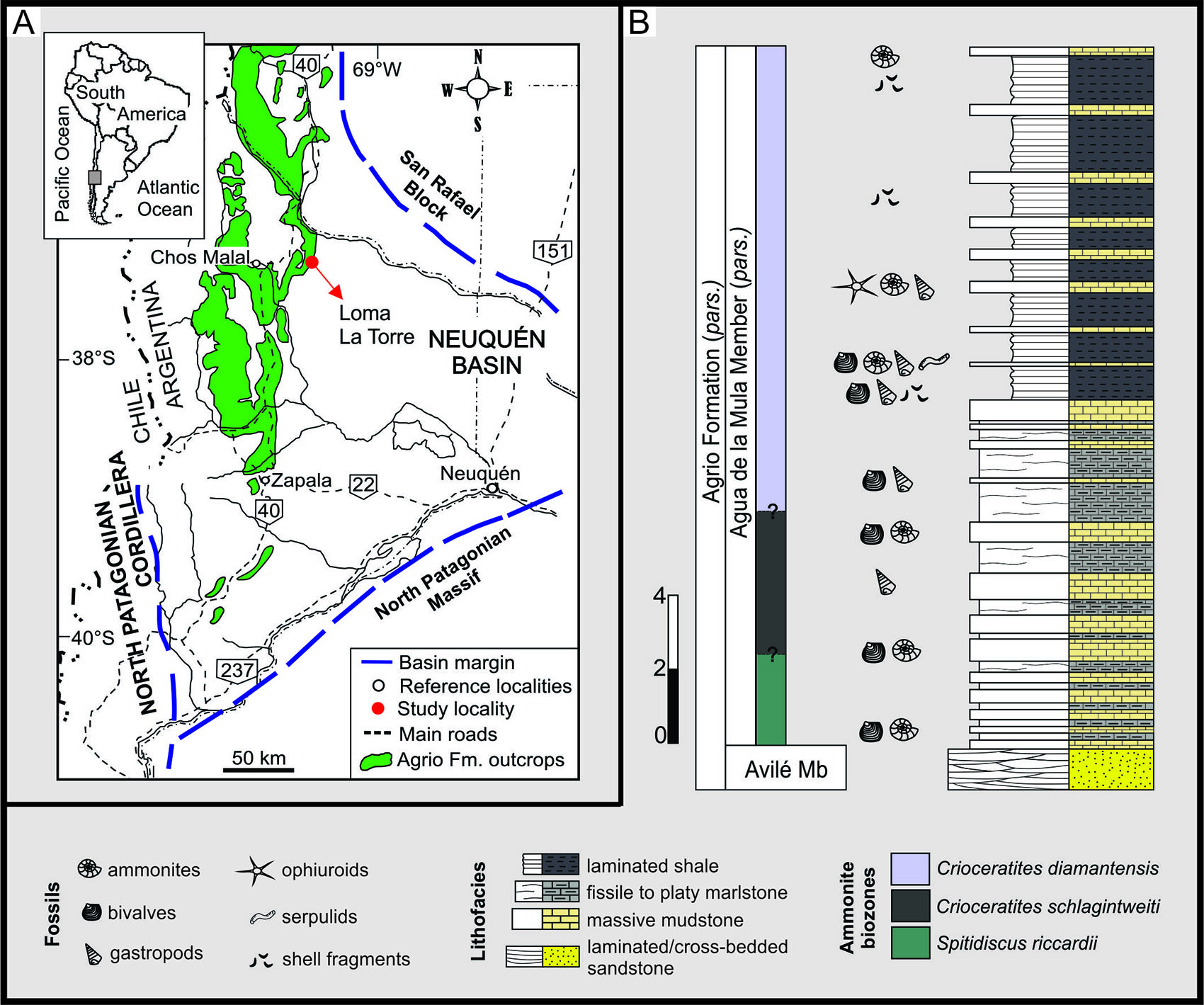 Fig. 1. A. Map of the Neuquén Basin and its location in Argentina and South America. Note the location of the Agrio Formation outcrops and the study site. Modified from Aguirre-Urreta et al. (2007). B. Logged section of the lowermost part of the Agua de la Mula Member, Agrio Formation, in Loma La Torre. Note the ophiuroid-bearing level. Ammonite biozones from Aguirre-Urreta et al. (2007, 2015).
