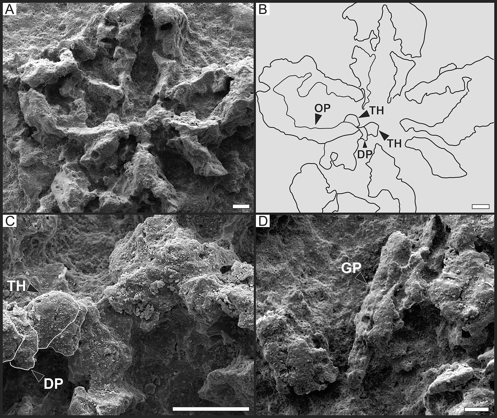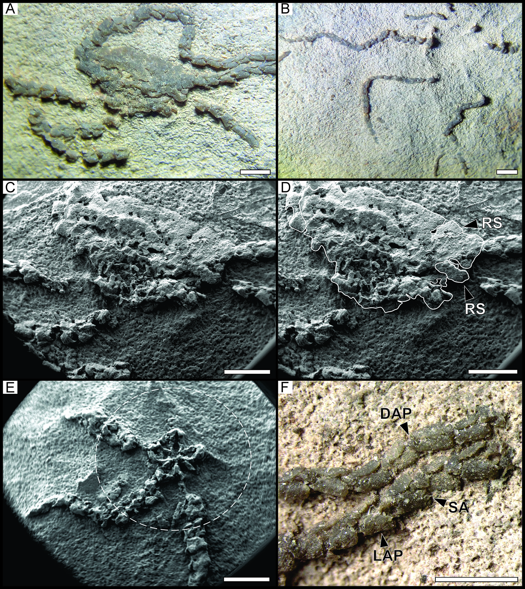 5. Discussion and conclusions Although the here-described specimens are rather poorly preserved (with some deformed areas and fragmented pieces), they show some characters of diagnostic value allowing for a placement in a taxonomic context at least to the genus level. Here, the shape of the spine articulations is of particular interest. According to Martynov (2010), Ophionereididae and Ophiochitonidae, which have recently been synonymized (O’Hara et al., 2017), present horseshoe-shaped arm spine articulations. Among the currently known fossil ophiuroid genera, horseshoe-shaped spine articulations were explicitly mentioned for Ophiopetra from the Late Jurassic of France (Hess, 1965a), although the diagnosis of the genus does not include information on the spine articulations (Enay and Hess, 1962) or other characters that are now considered to be diagnostic (Martynov, 2010; Thuy and Stöhr, 2011). Ophiopetra lithographica Hess in Enay and Hess, 1962 is currently the only valid species within this genus (Thuy et al., 2013), and we had the chance to study specimens of O. lithographica from the type locality (Figs. 5E, F). Scanning electron microscopy allowed us to confirm that the spine articulations of Ophiopetra lithographica are, indeed, similar to the horseshoe-shaped ones of the material described herein and the ones typical of Ophionereididae in general.