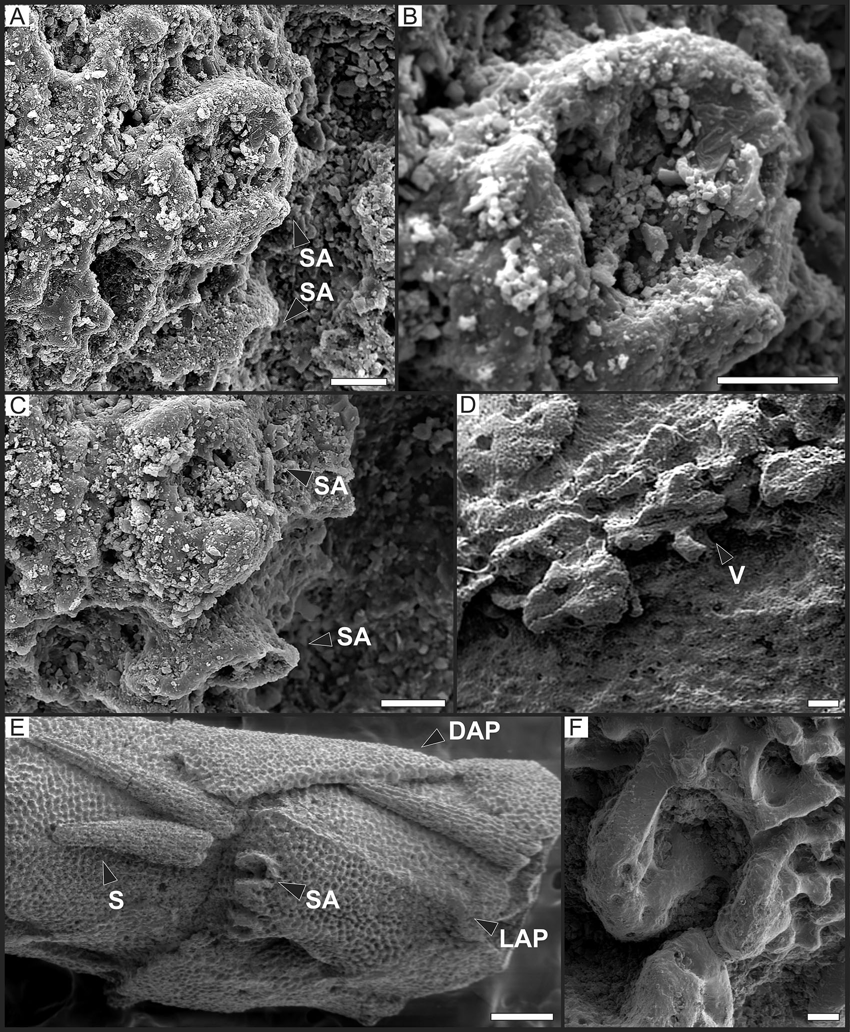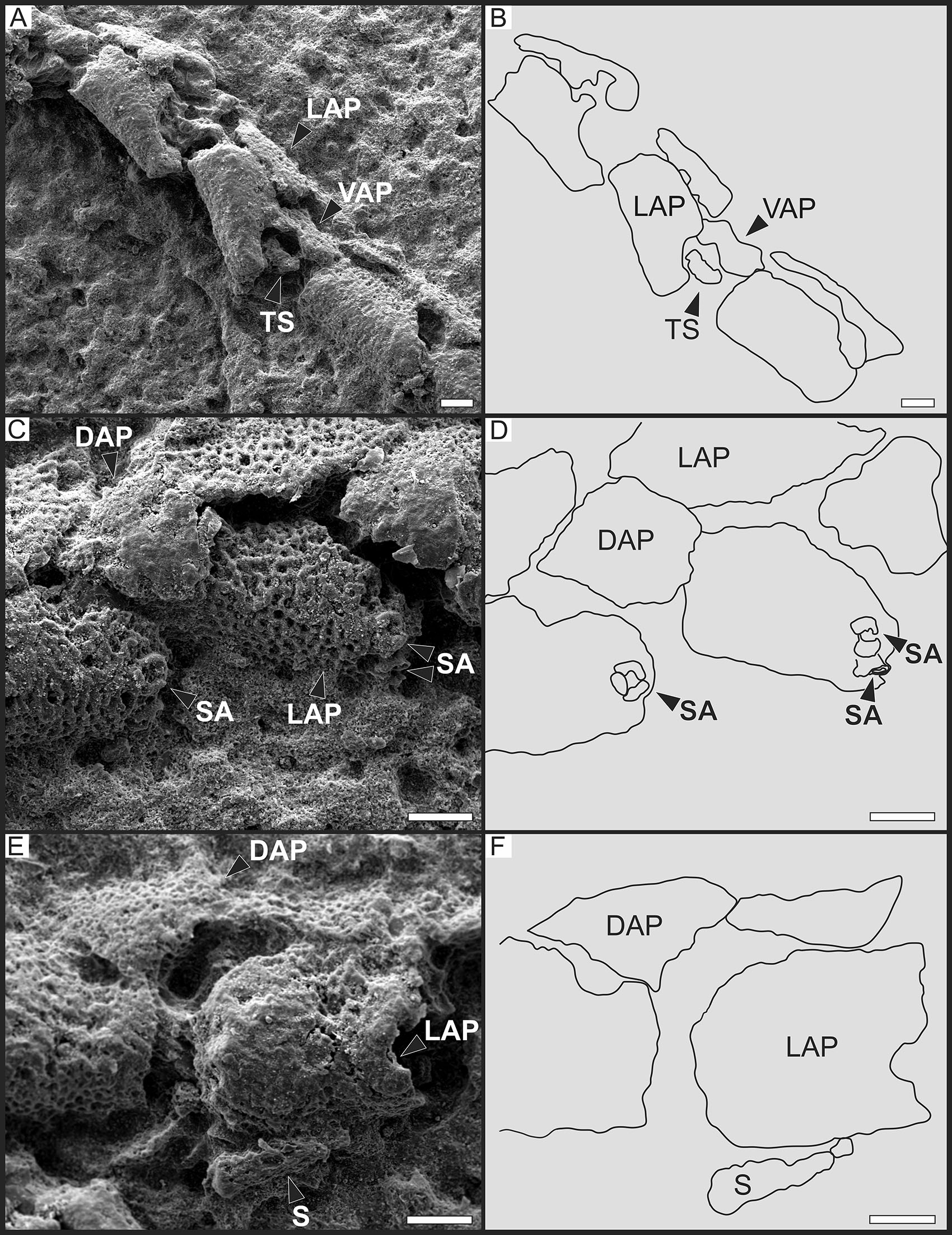 4. Results 4.1. Systematic paleontology Order Amphilepidida O’Hara et al., 2017 Diagnosis. Granules along the genital slit, extending onto disc edge. Accessory dorsal arm plates (Ophionereis). Scale-like, flat, oval to round tentacle scales. Tooth sockets dorsally as large fenestrations with septum. Arm spine articulation horse-shoe shaped, with parallel dorsal and ventral lobes proximally separated by vertical row of knobs or merged by ribbed border, framing nerve and muscle openings of almost equal size. Internal of lateral arm plate with large pore close to the dorsal edge of the tentacle pore excavation, at the ventral tip of a large ridge along the inner proximal edge that bends ventro-distalwards. Vertebrae with distally protruding dorsal keel and proximal dorsal groove (from OʼHara et al., 2018). Genus Ophiopetra Hess in Enay and Hess, 1962 Diagnosis. Small species. Disc with granules on both sides (including radial shields). Granules covering small imbricated disc scales. Radial shields and genital plates articulate with two condyles and a facet present in both the radial shield and the corresponding genital plate. Radial shields of moderate width, those of the same radius do not touch each other. Oral plates without large, wing-like flange. Double peristomial plates. Approximately six oral papillae contiguous on each side. Probably no tooth papillae. Teeth blunt, not very strong. Adoral shields meeting at proximal edge of oral shield. Arm spines in groups of three, erect, slightly longer than one arm segment. Ventral arm plates pentagonal, longer than wide, contiguous only on the proximal half of the arm. Dorsal arm plates triangular, with a strongly convex distal edge. Tentacles pores on almost the entire length of the arms, two tentacle scales per pore. Vertebrae with zygospondylous articulation (from Hess in Enay and Hess, 1962). Ophiopetra sp. Description. CPBA 20455.1(Figs. 2A, 2C-D, 2F, 4A-F, 5A-C). Deformed disc. Dorsal disc scales not discernible due to insufficient preservation; small granules are visible. Radial shields may be represented by two poorly preserved oval plates (Fig. 2D). Connection between the arms and the central disc is clear in two arms (Fig. 2A). Lateral arm plates stout, subquadrangular to subrectangular with distal edge convex and proximal and lateral edges mostly straight (Fig. 2F). Height/length ratio is approximately 0.62 in proximal lateral arm plates (Figs. 4E and F) while distal ones (Figs. 4A, C and D) are elongated (height/length=0.30). One or two horseshoe-shaped arm spine articulations per lateral arm plate (Figs. 5A, B and C). Arm spines smooth and probably conical with a maximum preserved length 2/3 as long as one arm segment (Figs. 4E and F). Dorsal arm plates subtriangular with convex distal edge, acute proximal edge and straight to slightly convex lateral edges (Figs. 4C and D). Ventral arm plates subrectangular with concave lateral edges, acute proximal edge and pointed to slightly convex distal edge (Figs. 4A and B). Only one elongated tentacle scale is preserved (Fig. 4A). On all observable arm segments, lateral arm plates separate dorsal and ventral arm plates (Fig. 2F). Outer surface of lateral and dorsal arm plates with coarse tubercles (Figs. 4C and E). CPBA 20455.2 (Figs. 2E, 3A-D, 5D). The specimen shows a faint outline of the disc, which is circular, approximately 3.5 mm in diameter (Fig. 2E). Oral plates long, relatively slender and slightly curved (Figs. 3A and B). Dental plate and at least one flat subquadrangular tooth are observed (Figs. 3A, B and C). Only one poorly preserved, rod-shaped genital plate (Fig. 3D) and one poorly preserved, much longer than wide/high vertebra are observed (Fig. 5D). CPBA 20455.3 (Fig. 2B) shows a faint outline of the disc. Five long and slender arms with a maximum preserved length of 9.98 mm, approximately 3 times longer than the disc diameter (Fig. 2B).