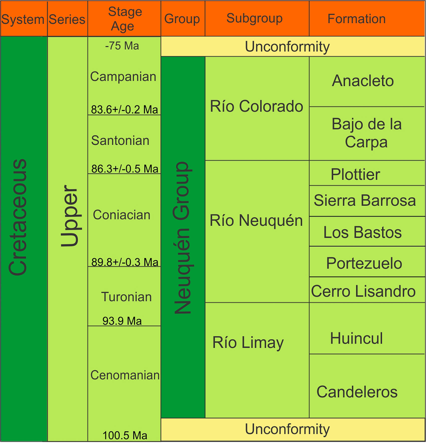 Leanza, H.A.; Apesteguia, S.; Novas, F.; De La Fuente, M.S. 2004. Cretaceous terrestrial beds from the Neuquén Basin, Argentina and their tetrapod assemblages. Cretaceous Research 25: 61-87.