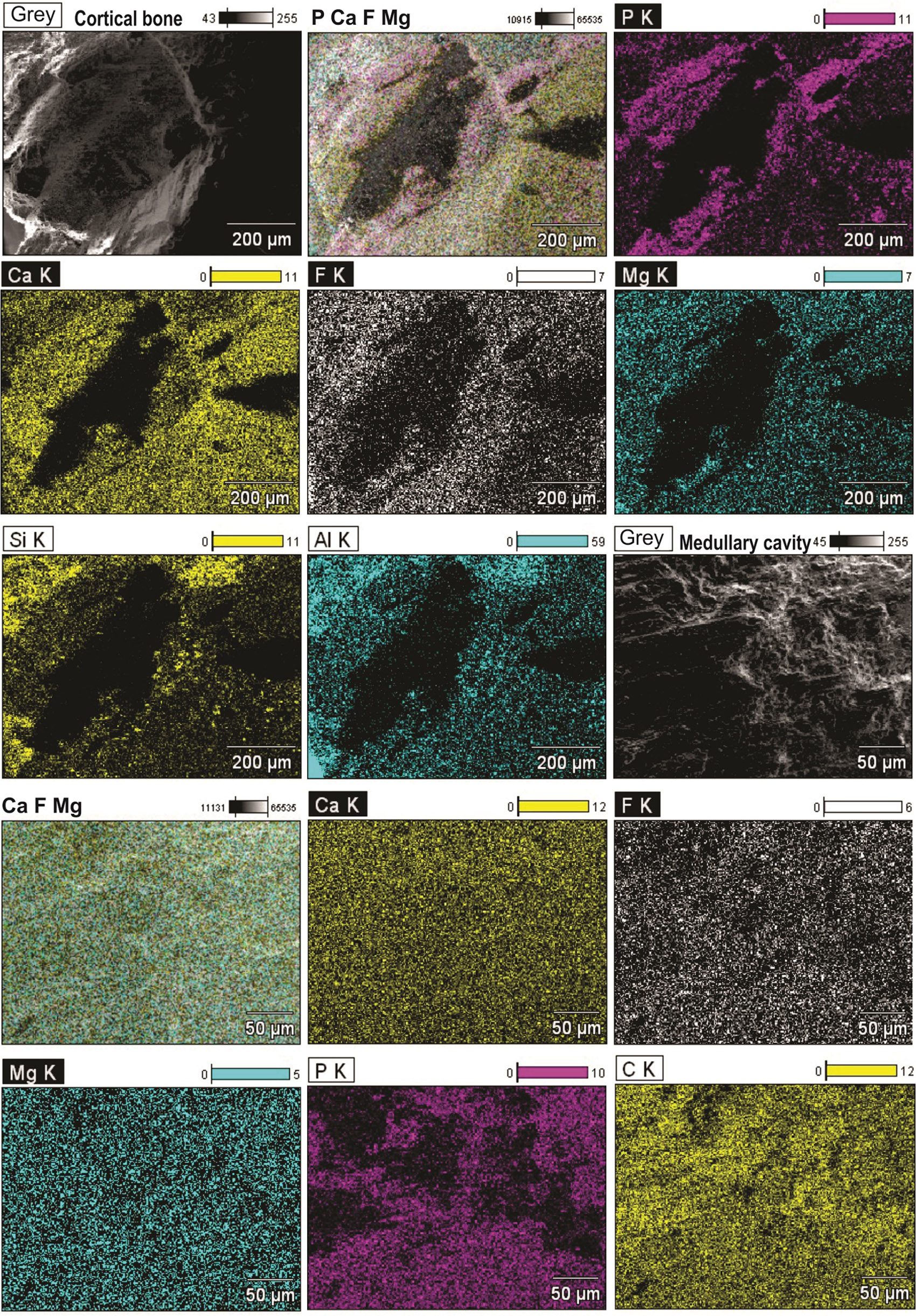 Furthermore, diagenetic processes, mineralization and compaction, which occurred in the burial environments (floodplain and fluvial channel) has been recognized in a previous study (Previtera, 2017). According to this study, after the burial, the main diagenetic processes that affected the dinosaur bones were compaction, plastic deformation, permineralization and substitution. The ionic substitution of the hydroxyapatite by francolite -in the bone microstructure- was confirmed, in the first moment through the XRD analysis (see Previtera, 2017), and also by the SEM-EDS method performed here. This is a typical mineral replacement of fossilized bone (Lucas and Prévôt, 1991; Kolodny et al., 1996; Elorza et al., 1999) and it is common in many other dinosaur sites (e.g., Hubert et al., 1996; Pereda-Suberbiola et al., 2000; Paik et al., 2001; Luque et al., 2009; Rogers et al., 2010; Piga et al., 2011; among others.