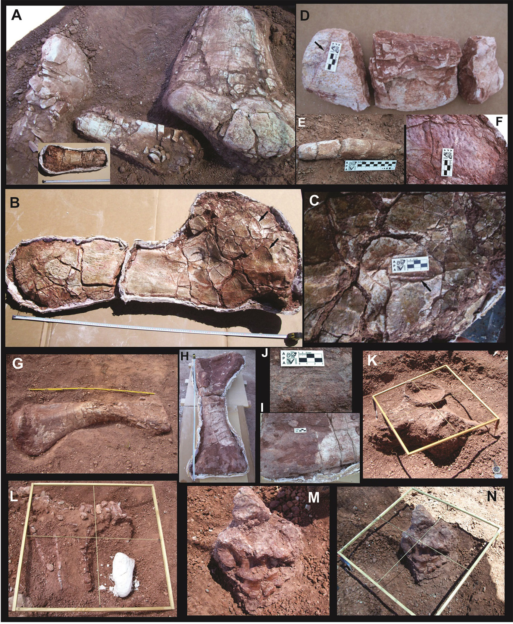 Fig. 8. Taphonomic modifications in dinosaur remains from the Cerro Guillermo area. A-F. Skeletal remains of a sauropod indet. IANIGLA-PV.113 from the CG1 site, FL 2. A. Associated bones (distal end of femur, fibula and proximal end of humerus) showing the longitudinal cracks that suggest advanced weathering; B-F. Appendicular bones, dorsal ribs and the scapula show transverse, oblique fractures and tubular fossil traces on the external surface; G-K.Skeleton remains of Notocolossus gonzalezparejasi UNCUYO-LD. 301 from the CG2 site, FL 1. The right humerus and dorsal vertebra display slight cracking of the periosteum; I, J. The right humerus showing bioerosion attributes on its external surface; L-N. Skeleton remains of Notocolossus gonzalezparejasi UNCUYO-LD. 302 from the CG3 site, FL 1. L.The anterior caudal section shows slight weathering before burial; M, N. The foot displays slightly horizontal thrust of the metatarsals I and II due to compaction phenomena. See text for further explanation.