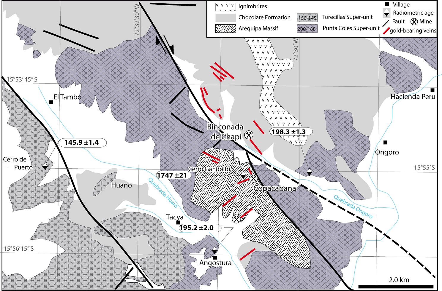 The studied area is a thin strip (<15 km wide) of rocks belonging to the Coastal Batholith. This area contains gold-bearing quartz veins hosted in metamorphic and volcano-sedimentary rocks, and porphyry copper deposits (Fig. 1).