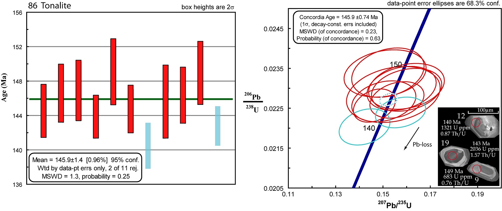 Zircon spot U-Pb analyses from regional equigranular tonalite (sample 89, table 1), collected from village of Andamayo (Río Colca). Eight of twenty analyzed zircons yield an age of 182.3±1.7 Ma (Fig. 4E).