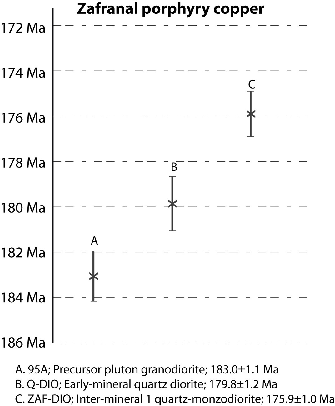 The denomination of the different magmatic phases (precursor, pre-, inter-, and post-mineralization) were made during the geological mapping and drill-core logging stages, performed by geologists of AQM Peru S.A.C. and summarized by Tejada (2010), Fernandez-Baca (2011), Rivera et al. (2008, 2010), Rivera (2012a, b), and De Ruijter et al. (2013). This observation has allowed to obtain relative ages, and here were included the approximate duration of different porphyry bodies related to the copper mineralization in Zafranal, determined by using exclusively U-Pb zircon dating.