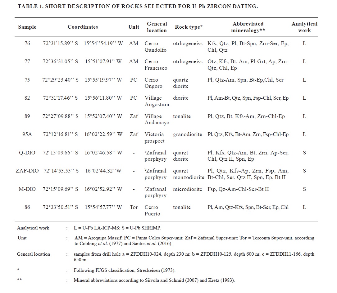 Sampling was conducted mainly in two transects (Fig. 1) and 10 representative samples of metamorphic and plutonic rocks as well as intrusives associated with porphyry copper mineralization in Zafranal deposit were selected for the U-Pb dating. Sample locations are shown in figure 1. Coordinates, unit, description, abbreviated mineralogy and the analytical work carried out on each sample are presented in table 1. Unit designations is following the nomenclature proposal of Cobbing et al. (1977) and Santos et al. (2016) (see Fig. 1).