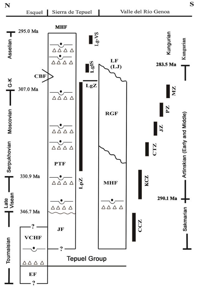 The Upper Paleozoic deposits of central-west Patagonia infilled the Tepuel-Genoa Basin, which extends between 43º-44º 20’ S and 69º 30’-71º W for approximately 250 km in central-western Chubut Province. Patagonia was located at the southwestern margin of Gondwana and was possibly separated from southern South America as an independent block that collided with the continental margin during late Paleozoic times (Ramos, 1984, 2008; Pankhurst et al., 2006). Upper Paleozoic rocks of the basin are widely exposed in the north-south arranged Sierras de Tepuel, Tecka, Languiñeo, Cerro Excursión and Valle Chico (near the town of Esquel), Valle del Río Genoa, El Molle and Pampa de Agnia regions (Fig. 2). After the pioneer studies of Keidel (1922) and Piatnitzky (1933, 1936), Suero (1948, 1953, 1958) first outlined the general stratigraphy of the basin and determined the Late Paleozoic age of these deposits, based mainly on preliminary identifications of plants and marine invertebrates remains. Many subsequent studies allowed a better understanding of the stratigraphy, paleoenvironment and paleontological content of the basin (Pagani and Taboada, 2010 and references therein). The most commonly used stratigraphic nomenclature was proposed by Page et al. (1984), who identified a tripartite succession that includes the Jaramillo, Pampa de Tepuel and Mojón de Hierro formations (Freytes inLesta and Ferello, 1972; emend. Page et al., 1984). The Río Genoa Formation (Lesta and Ferello, 1972; emend. Andreis et al., 1986) assembles the southernmost outcrops of the basin, and is interpreted as partially equivalent to the Mojón de Hierro Formation (Lesta and Ferello, 1972; Page et al., 1984; Andreis et al., 1986; Hlebszebitsch and Sabattini, 2005). Recently, Taboada and Pagani (2010) and Pagani and Taboada (2011) suggested a possible minor lateral interfingering between the uppermost part of the Mojón de Hierro Formation and the lowermost part of the Río Genoa Formation. These formations constitute the Tepuel Group, a major lithostratigraphic unit with its type section in the Sierra de Tepuel (Suero, 1948; nom. subs. Borrello, 1969; emend. Page et al., 1984). The Tepuel Group is a late Tournaisian-Artinskian glacial-influenced siliciclastic sequence nearly 6,000 m thick that unconformably overlies the Catreleo Devonian granite (Robbiano, 1971) and underlies Lower Jurassic marine strata.
