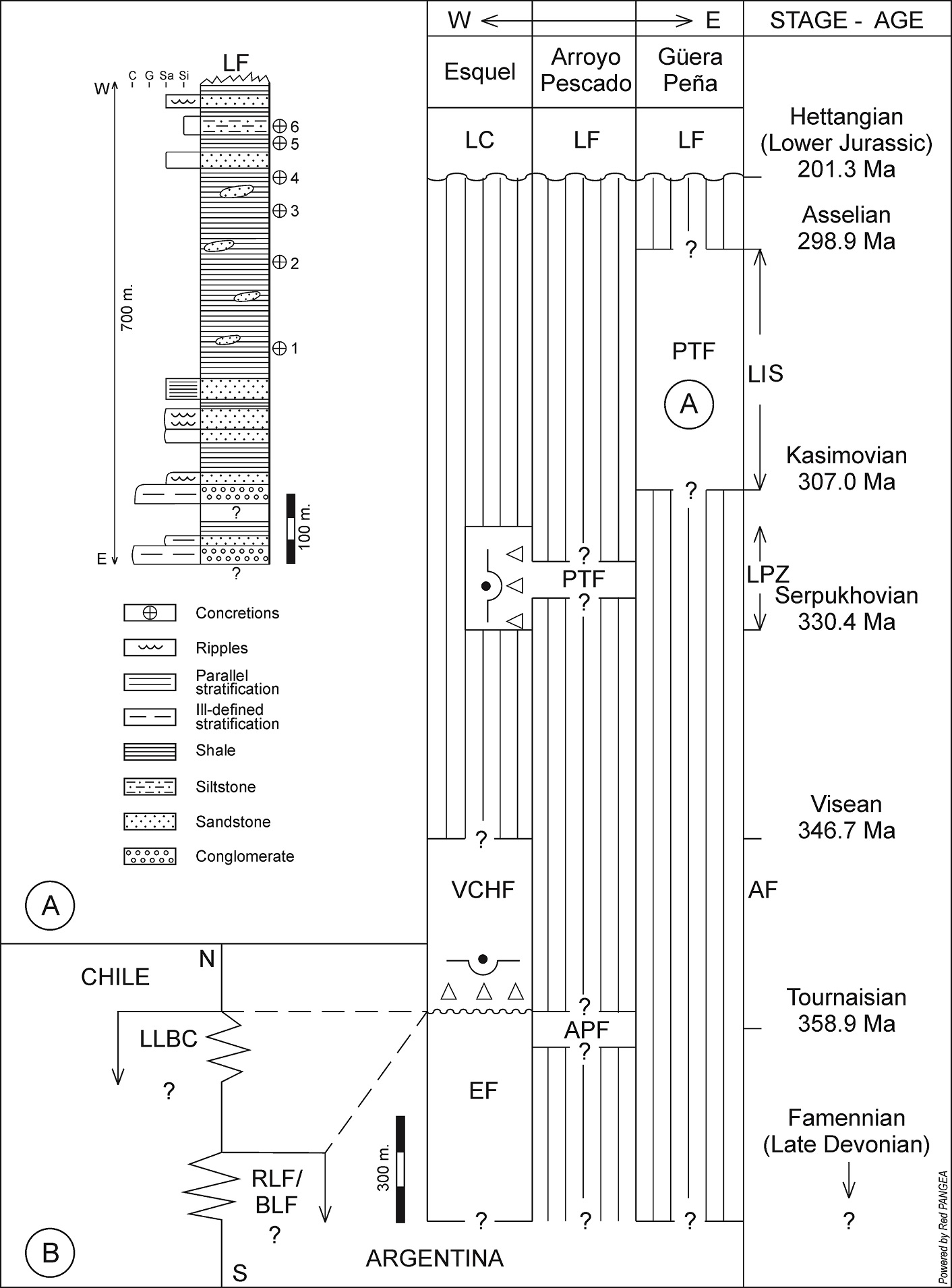 The studied section was mapped near the northwestern corner of the “Geological Chart 44c Tecka” by Turner (1982), although it was not segregated from the Jurassic Lepá Formation until Vizán et al. (1996) regarded it as a fossiliferous Carboniferous succession. An E-W stratigraphic section of unknown base near Puesto Güera is about 700 m thick and unconformably underlies the Jurassic marine Lepá Formation at both sides of the Quebrada de Güera-Peña. Alternations of sandstones and conglomerates with intercalations of shales characterize the lower half of the section, while black shales with fossiliferous concretions dominate the upper half (Alberti, 1988; Vizán et al., 1996) (Fig. 4A).