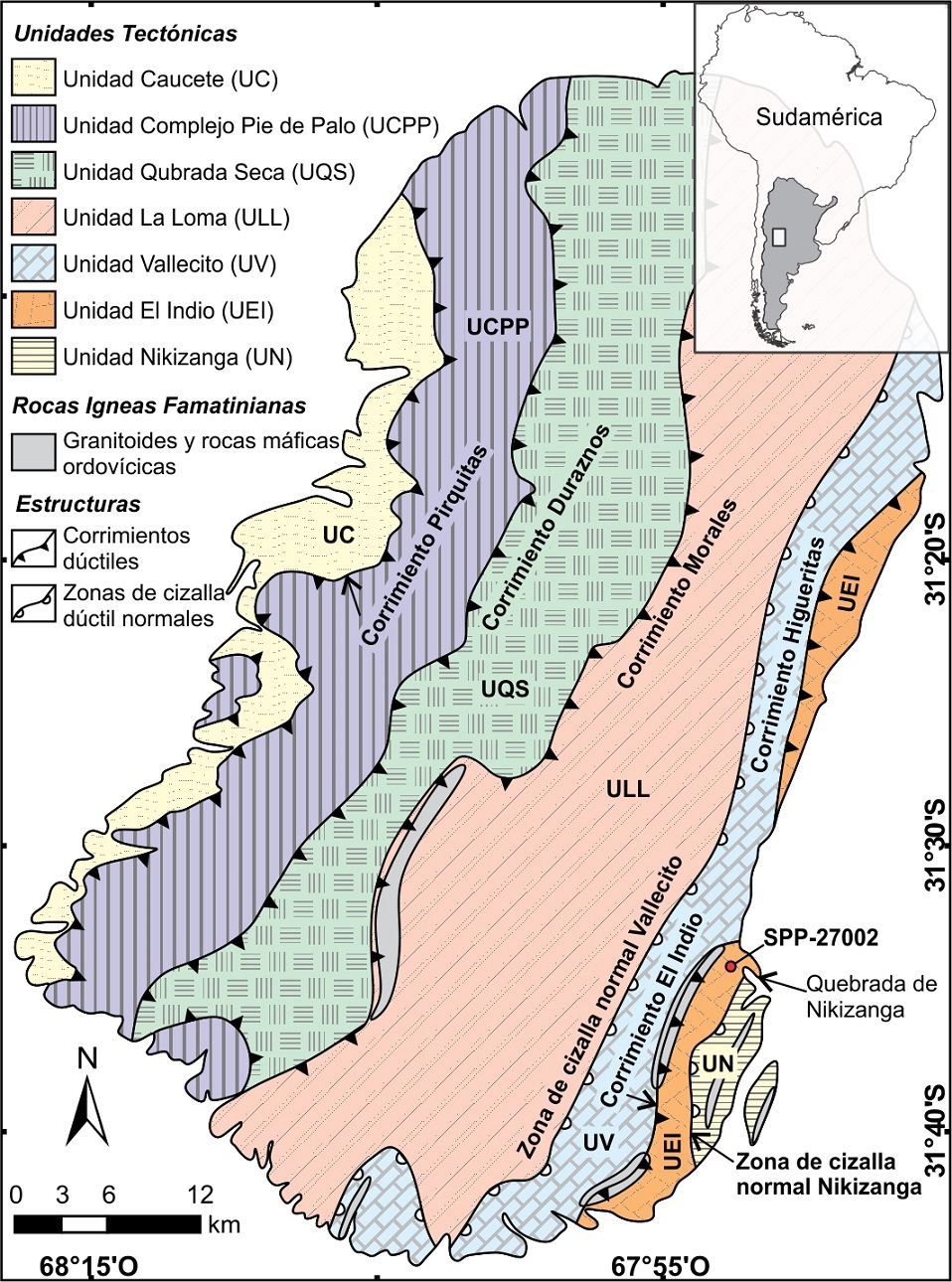 La UC, ubicada por bajo del corrimiento Pirquitas (van Staal et al., 2011 y referencias allí citadas), está formada por el Grupo Caucete, una serie metasedimentaria compuesta principalmente de rocas carbonáticas y siliciclásticas con una edad de sedimentación neoproterozoica a cámbrica (Galindo et al., 2004; Naipauer et al., 2010). La UCPP se encuentra entre los corrimientos Pirquitas y Duraznos y está compuesta principalmente por rocas máficas y ultramáficas interpretadas como un complejo ofiolítico mesoproterozoico grenvilliano (e.g., Vujovich y Kay, 1998). La UQS, aflora entre los corrimientos Duraznos y Morales (Ramacciotti, 2016) y corresponde a un basamento de difícil acceso y poco conocido, compuesto principalmente por migmatitas, ortogneises, esquistos y cuarcitas mesoproterozoicas y una cubierta de mármoles y anfibolitas neoproterozoicas equivalente a la Secuencia Metasedimentaria Difunta Correa (SMDC; v. abajo) (Casquet et al., 2001; Vujovich et al., 2004; Mulcahy et al., 2011). La edad de las rocas ígneas mesoproterozoicas alojadas en la UCPP y la UQS varían entre ca. 1.030 y 1.280 Ma (Vujovich et al., 2004; Morata et al., 2010; Rapela et al., 2010; Mulcahy et al., 2011; Garber et al., 2014). Además, dentro de la UQS se encuentran alojados ortogneises tipo “A” con una edad de cristalización de ca. 775 Ma interpretados como evidencia de la ruptura temprana del supercontinente Rodinia (Baldo et al., 2006). La ULL se extiende entre el cabalgamiento de Morales y la faja de cizalla normal Vallecito y está compuesta principalmente por cuarcitas oscuras pertenecientes a la unidad litoestratigráfica La Loma (Ramacciotti et al. 2015a y b) dentro de la SMDC. La SMDC está constituida por una compleja unidad metasedimentaria de plataforma continental, depositada en el Ediacariano inferior, compuesta por rocas metasiliciclásticas y metacarbonáticas, descrita y datada por Baldo et al. (1998), Rapela et al. (2005), Ramacciotti et al. (2015a, b). La UV se encuentra entre la zona de cizalla Vallecito y el corrimiento El Indio y se compone principalmente de mármoles pertenecientes a la SMDC mientras que la UEI aflora entre el corrimiento homónimo y la zona de cizalla normal Nikizanga y se compone de rocas metasiliciclásticas además de abundantes intrusiones graníticas ordovícicas alojadas en dicho cabalgamiento (e.g., Granito El Indio; Baldo et al., 2012). Al este de la faja de cizalla extensional Nikizanga aflora la UN formada por el Grupo Nikizanga y la SMDC. El Grupo Nikizanga está formado por rocas metamórficas de bajo grado (mármoles grafíticos, cuarcitas, y filitas) cuyos protolitos sedimentarios se depositaron en el Cámbrico (Ramacciotti et al., 2018). Esta secuencia ha sido correlacionada sobre la base de la composición isotópica de Sr de mármoles y edades U-Pb en circones detríticos con el Grupo Caucete y con el Grupo Mesón del noroeste de Argentina, y ha sido interpretada como una depositación en una plataforma continental perteneciente al margen suroccidental de Gondwana (Ramacciotti et al., 2018).