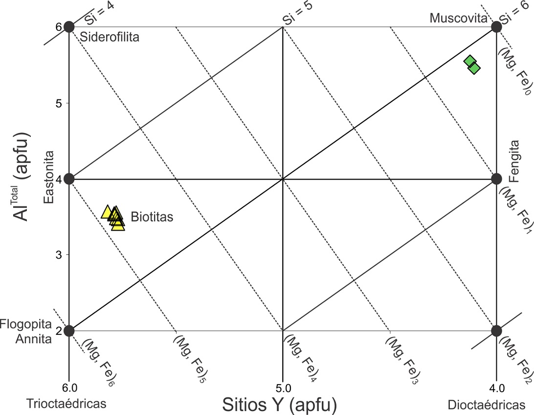 Los Grt1 poseen una zonación química típica de un progrado metamórfico con una disminución del contenido de espesartina (Sps), y aumento de almandino (Alm) y piropo (Prp) desde el núcleo hacia los bordes, mientras que la grosularia (Grs) se mantiene sin demasiada variación (Fig. 5A-D). Los núcleos de estos granates tienen una composición promedio Alm=0,71, Sps=0,14, Grs=0,11, y Prp=0,04; en tanto que los bordes del mismo tienen los siguientes valores: Alm=0,79, Sps=0,04, Grs=0,08, y Prp=0,09. El Grt2 está compuesto por Alm=0,72, Sps=0,01, Grs=0,15, y Prp=0,12. Los porfiroblastos de estaurolita no poseen variaciones composicionales significativas a lo largo de los cristales con valores de XFe (Fe/Fe+Mg) entre 0,79 y 0,82, con un promedio de 0,80 (n=48; Fig. 5E y F). Las biotitas poseen valores de XFe entre 0,49 y 0,43, Altotal (apfu) entre 3,39 y 3,58, en tanto que las muscovitas tienen valores de XFe=0,38-0,44 y Altotal (apfu)=5,47-5,58 (Fig. 6), y la plagioclasa es de composición andesina (Ab58).