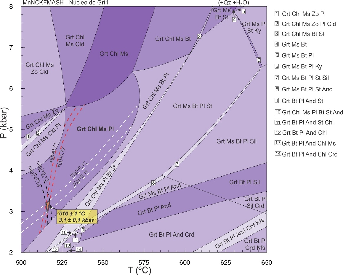 Para establecer las condiciones de presión y temperatura de equilibrio al momento de la blástesis del núcleo del Grt1 se utilizaron las isopletas calculadas a partir del análisis de dicho granate (punto 25 del perfil mostrado en la figura 5B). Las curvas se intersectan en el campo con la asociación Grt+Chl+Ms+Pl+Qz+H2O (abreviaturas minerales según Whitney y Evans, 2010), limitando las condiciones de equilibrio a 3,1±0,1 kbar y 516±1 ºC (área naranja en la figura 7).