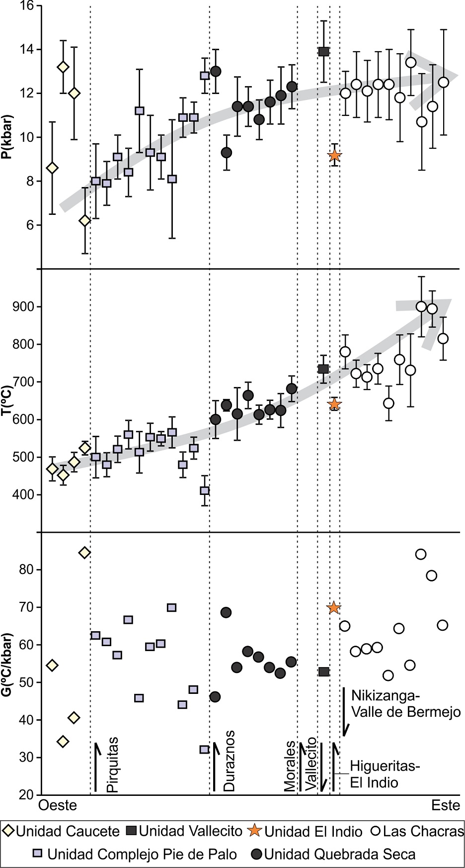 La figura 12 muestra la variación E-O de las condiciones P-T en el antearco famatiniano desde Loma de Las Chacras al este, hasta el Grupo Caucete en la SPP al oeste, encontrándose una disminución en las condiciones termobarométricas en dicho sentido. La muestra analizada (SPP-27002; Unidad El Indio) posee una presión inferior a la esperada según la línea de tendencia mostrada en la figura 12. Dicha diferencia puede deberse a causas geológicas (e.g., diferentes grados de enterramiento de las láminas de corrimiento) o a cuestiones metodológicas, ya que las muestras analizadas en trabajos previos han sido tratadas con termobarómetros convencionales. En cualquier caso los 9 kbar obtenidos en este trabajo son compatibles con el engrosamiento del antearco propuesto por Casquet et al. (2012b).