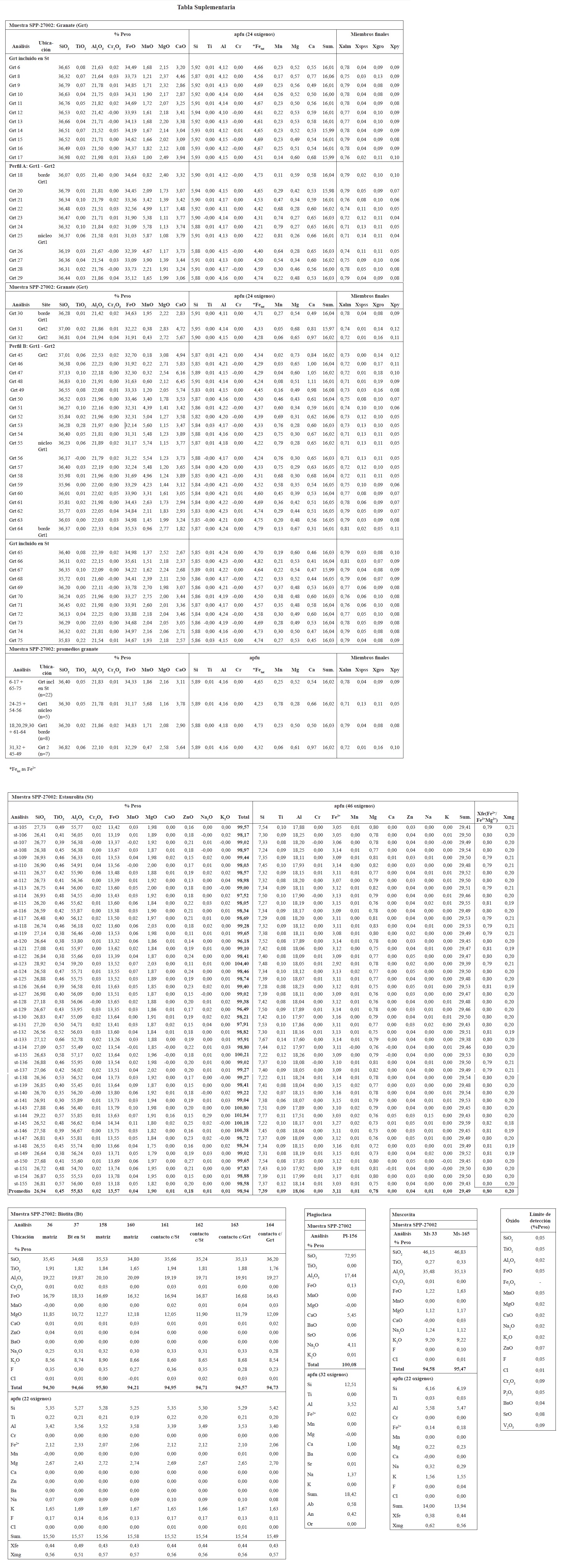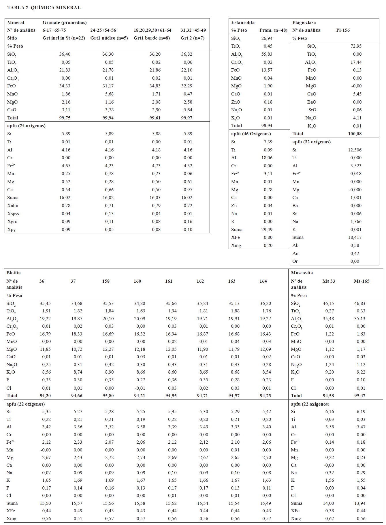 La composición química de los minerales se determinó en el Laboratorio de Microscopía Electrónica y Análisis por Rayos X (LAMARX) de la Universidad Nacional de Córdoba mediante una microsonda JEOL-JXA-8230. Para análisis realizados con WDS (Wavelength Dispersive X-ray Spectroscopy) se utilizó un voltaje de 15 kV y una intensidad de corriente de 20 nA con un haz de 5 micras de ancho, mientras que para los análisis realizados con EDS (Energy Dispersive X-ray Spectroscopy) se utilizó un voltaje de 15 kV y un tiempo de conteo de 60 segundos. Las composiciones minerales se encuentran en la tabla 2 y en la tabla suplementaria.