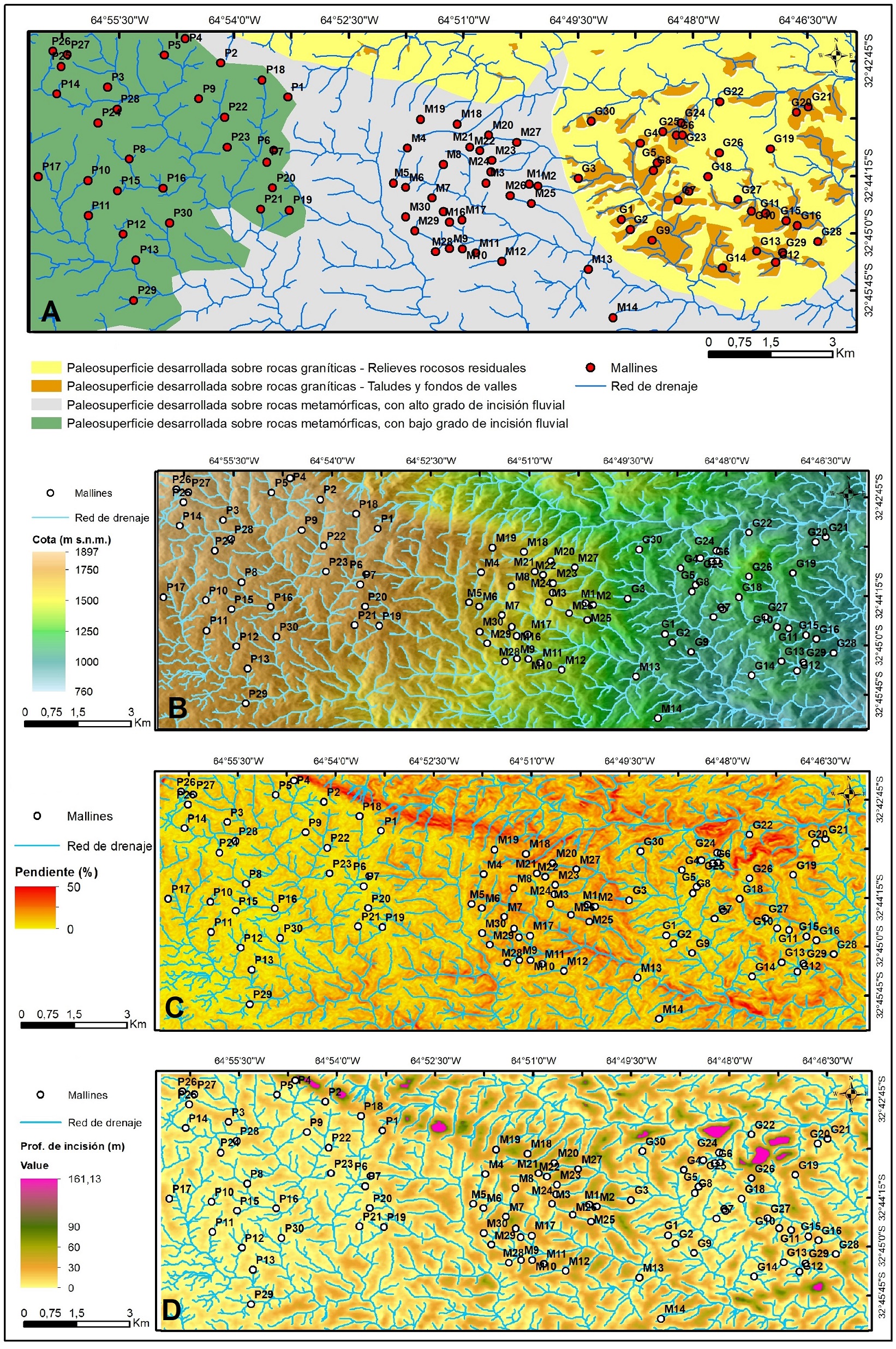 El área de estudio forma parte de una extensa superficie de erosión desarrollada con anterioridad a la orogenia andina (Carignano et al., 1999; Rabassa et al., 2010; Andreazzini y Degiovanni, 2014) que constituye la pendiente estructural oriental de la Sierra de Comechingones. La misma presenta distinto grado de incisión fluvial, en función de su localización dentro de las morfoestructuras mayores (megabloques) y de la litología presente. Se diferenciaron tres unidades geomorfológicas, y la caracterización de los mallines se realizó en relación a estas unidades (Fig. 4A).