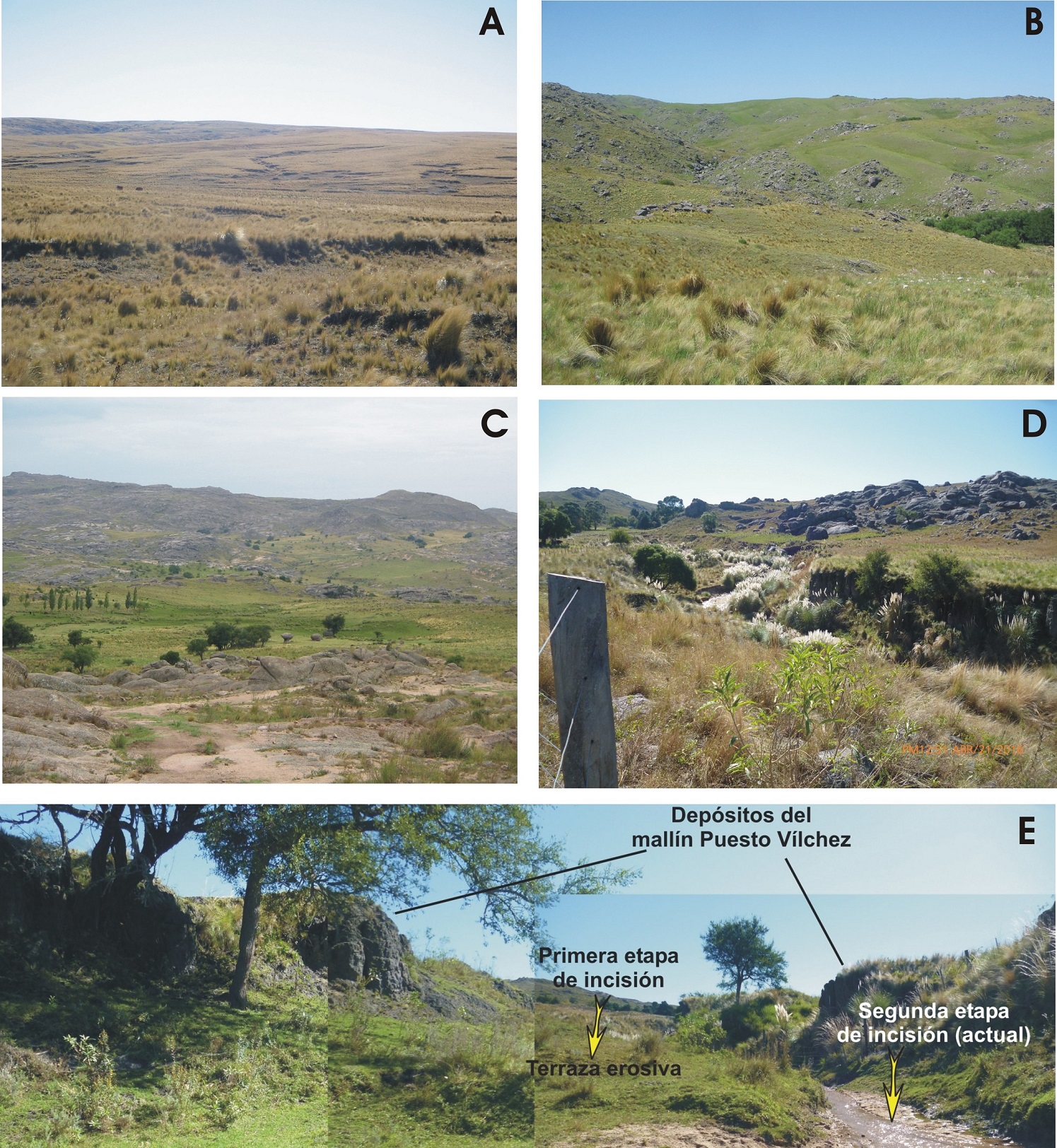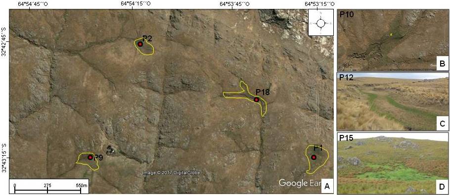 Fig. 8. A. Detalle de un sector de la paleosuperficie metamórfica con bajo grado de incisión fluvial (imagen satelital Google Earth). Con contornos amarillos se indican las áreas ocupadas por algunos de los mallines estudiados. B. Vista de detalle del mallín P10, donde se observa una cárcava en retroceso. C-D. Vistas de los mallines P12 y P15 (la ubicación de los tres últimos se encuentra en la figura 4).