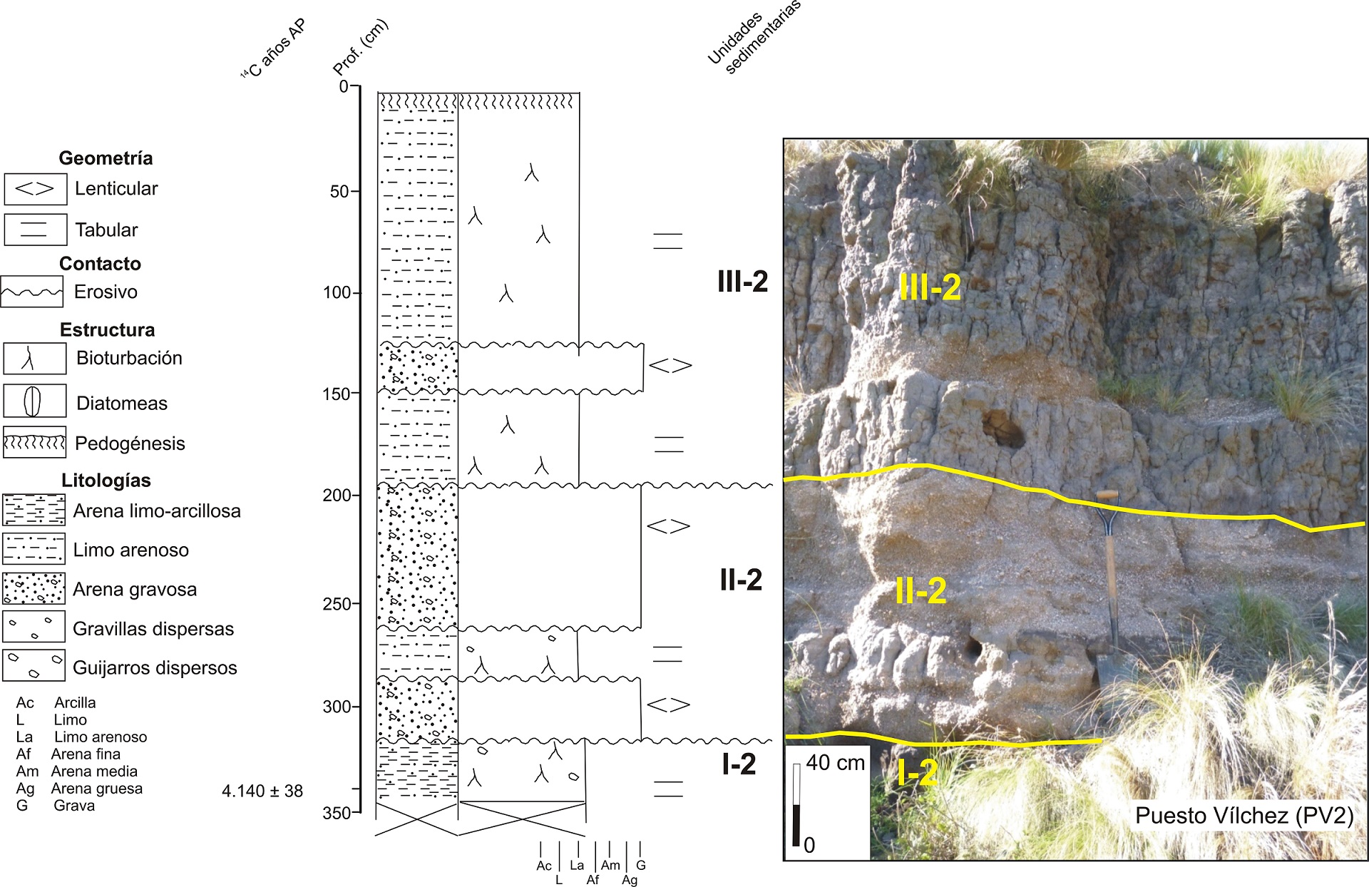 En las secciones PV1 y PV2 se determinó textura, color (Tabla de Color de Munsell), estructuras sedimentarias, grado de compactación, grado de bioturbación, tipo de contactos entre las unidades sedimentarias. En el laboratorio las muestras de sedimentos se secaron a temperatura ambiente y, posteriormente, se desagregaron mecánica y químicamente. La distribución por tamaño de partícula se obtuvo utilizando un contador láser de partículas Malvern (modelo Mastersizer Hydro 2000); luego se clasificó según la propuesta de Folk et al. (1970) y se procesaron estadísticamente según Folk y Ward (1957). Se determinó el contenido de carbono orgánico total (COT) por pérdida por ignición (Heiri et al., 2001), utilizando 7 g de muestra tamizada a 2 mm.