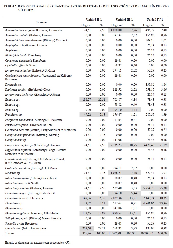 En el perfil PV1 se realizó un análisis cuantitativo de diatomeas en tres muestras. El material se disolvió en agua, el conteo de los frústulos se realizó bajo una magnificación de 400x y la identificación de especies a 1000x utilizando un microscopio Zeiss estándar 16. La identificación y la información ecológica de las diatomeas se basó en Krammer y Lange Bertalot (1986, 1988, 1991, 2000, 2004); Lange Bertalot (2001); Kusber y Jahn (2002) y Metzeltin et al. (2005).