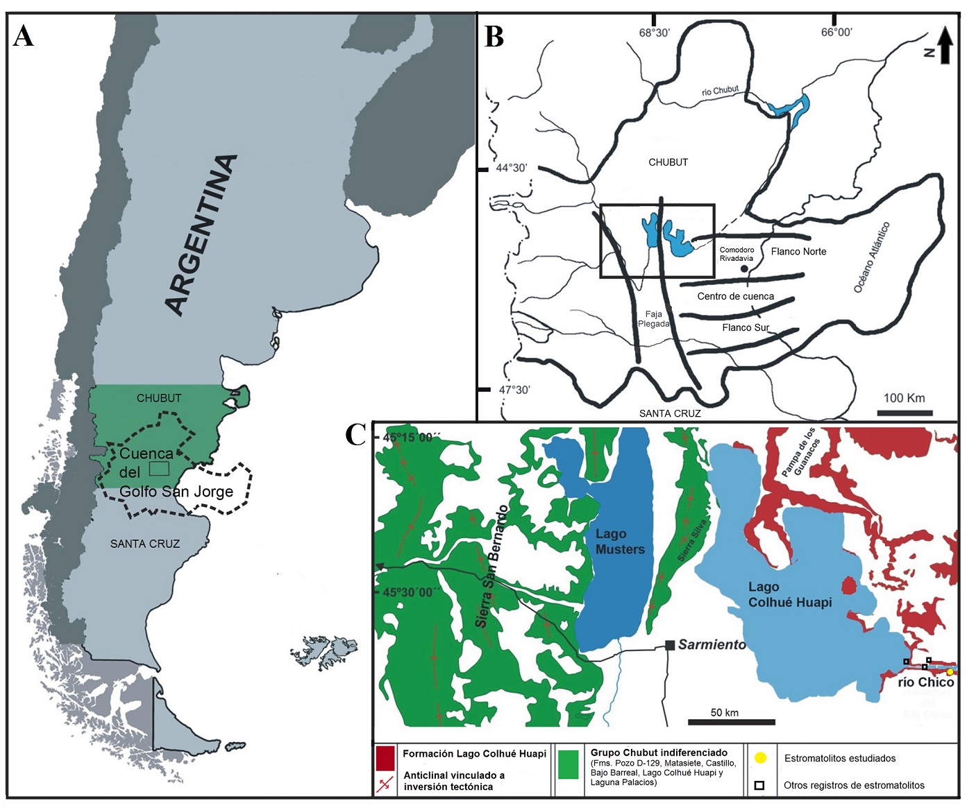 En esta contribución se da a conocer el primer registro de estructuras estromatolíticas en la Cuenca del Golfo San Jorge, provenientes de la parte cuspidal de la Formación Lago Colhué Huapi (Fig. 3A-B), en la localidad nacientes del río Chico. Se describe en particular el estromatolito denominado aquí E1 (Fig. 2 A-B), que se encuentra asociado a un abundante y diverso registro fósil representado al momento por palinomorfos, fragmentos de troncos silicificados, cáscaras de huevos y restos de dinosaurios. En un contexto más amplio, el presente estudio contribuye al conocimiento del paleoambiente sedimentario y de la biodiversidad en este intervalo estratigráfico, representando una herramienta de interés para la interpretación de este tipo de ambientes no marinos en otras cuencas sudamericanas.
