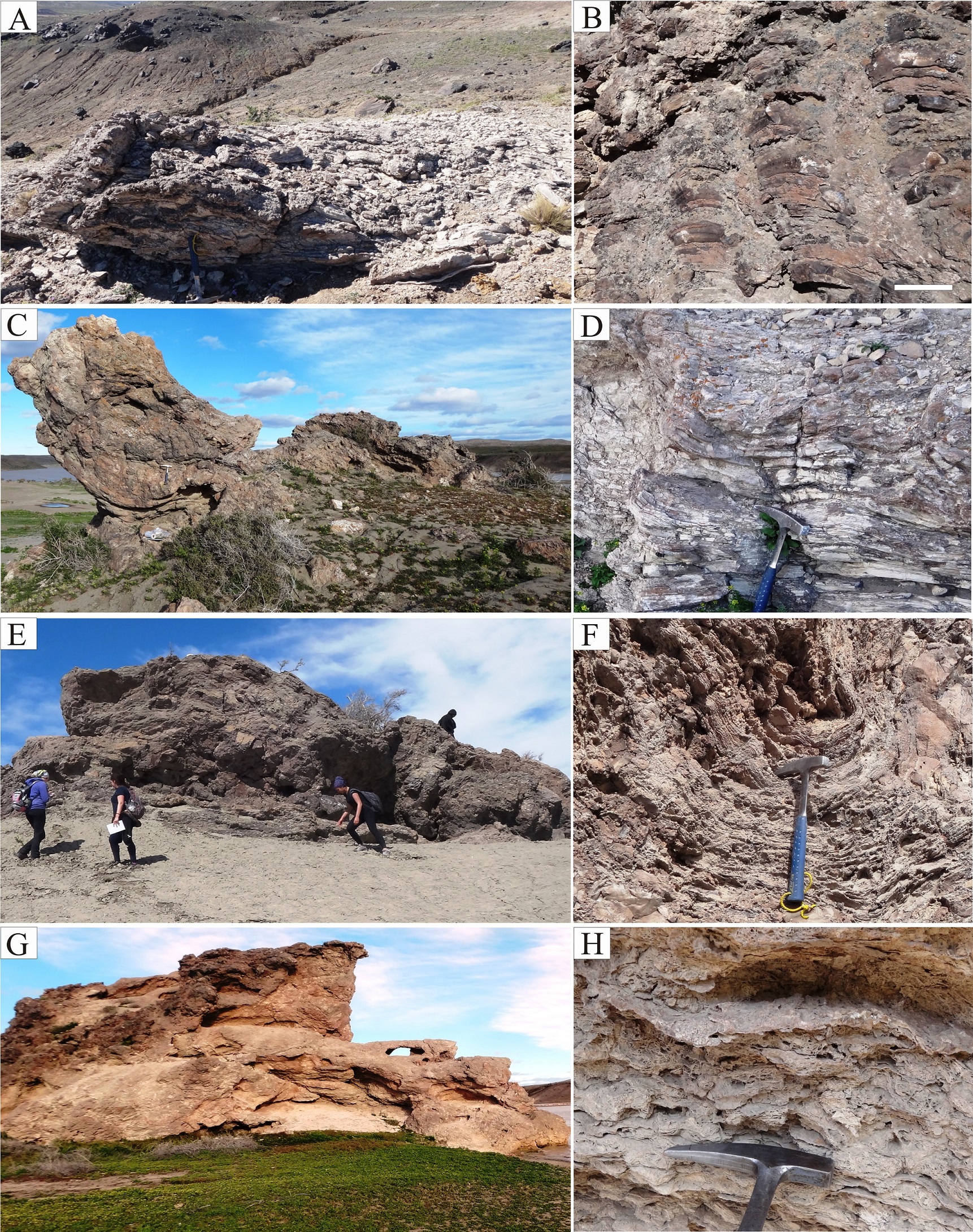 La Cuenca del Golfo San Jorge está ubicada entre las latitudes 44° S y 47° S y los meridianos 65° O y 71° O, abarcando el sector sur de la provincia de Chubut y el sector norte de la provincia de Santa Cruz, en la Patagonia central, Argentina (Fig. 1A, B). El potencial hidrocarburífero de la cuenca ha dado lugar a numerosos estudios dedicados a la caracterización y a una mejor comprensión del registro estratigráfico con interés económico. Nuevos estudios geológicos y paleontológicos realizados en los depósitos terminales del Grupo Chubut (Lesta y Ferello, 1972), en particular en afloramientos de la Formación Lago Colhué Huapi (Casal et al., 2015) en las nacientes del río Chico (Fig. 1C) han dado lugar a numerosas publicaciones (Allard y Casal, 2013; Foix et al., 2014; Casal et al., 2015, 2016; Vallati et al., 2016, 2017a, b; De Sosa Tomas et al., 2017; Ibiricu et al., 2017). En esta región, recientemente se han descubierto cuatro estructuras estromatolíticas (Fig. 2A-H).