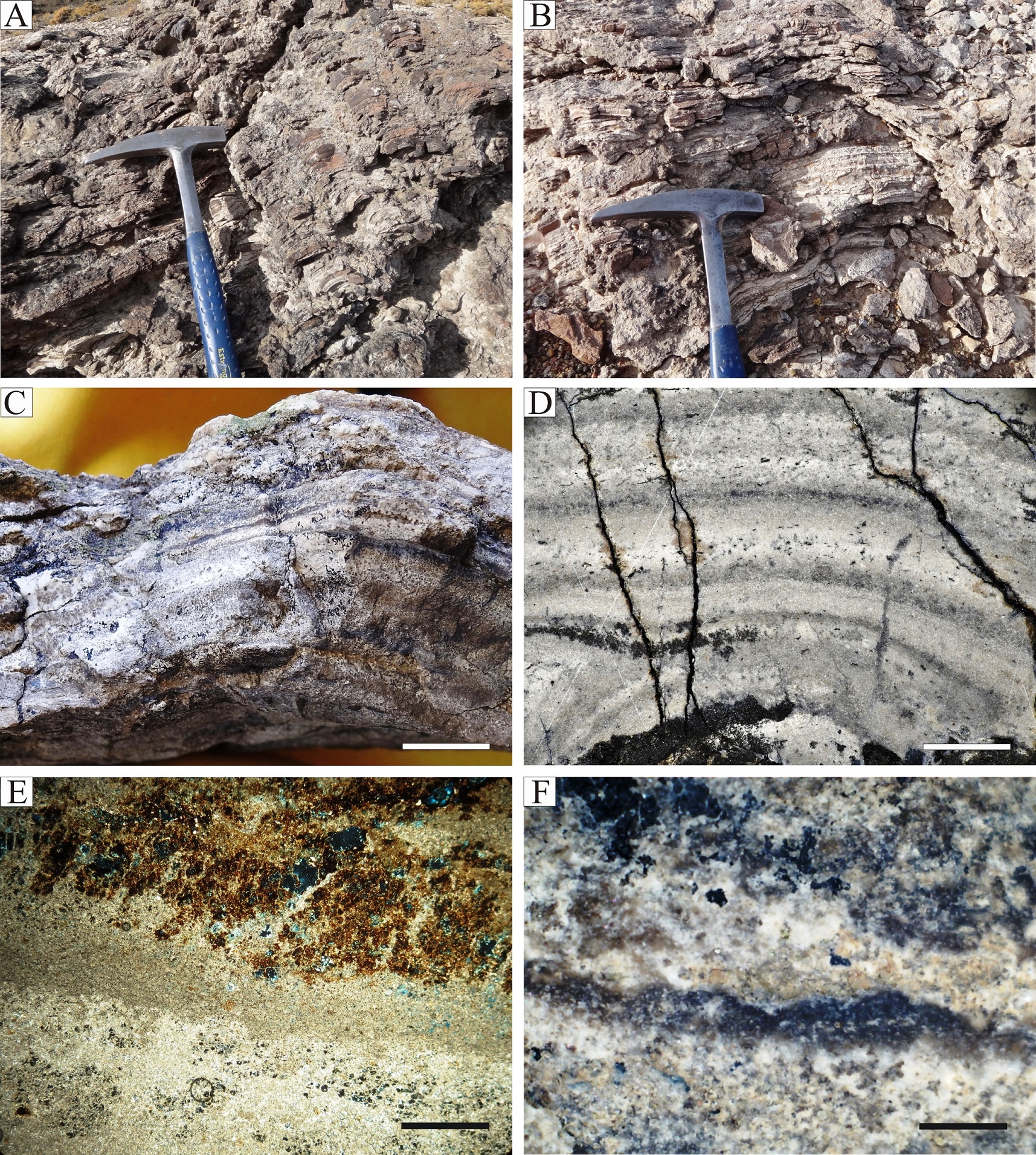 E1: Está incluido en el relleno sedimentario de arreglo general granodecreciente que se dispone por encima de la superficie erosiva (Fig. 3B). El E1 presenta una geometría dómica (Figs. 2A-B, 4A-B), con aproximadamente 1 m de potencia y hasta 3 m de extensión lateral aflorante (Figs. 2A, 3B). Se reconoce una fábrica laminar plana dominante y bien definida, con alternancia de láminas de colores oscuros y claros de 2 mm de espesor medio, con valores máximos de 6 mm y mínimos de 0,7 mm (Fig. 4C-F). Las láminas claras presentan principalmente calcita cristalina de grano fino (micrita) formadas por precipitación inducida por microbios, con la presencia de probables restos de ostrácodos articulados (Fig. 5A) y valvas desarticuladas no fragmentadas (Fig. 5B), de hasta 1 mm de longitud e incluidas entre la laminación. Sobre el techo del E1 se registraron grietas poligonales, irregulares en forma y tamaño, de bordes angulosos y de escaso rechazo (Fig. 6).