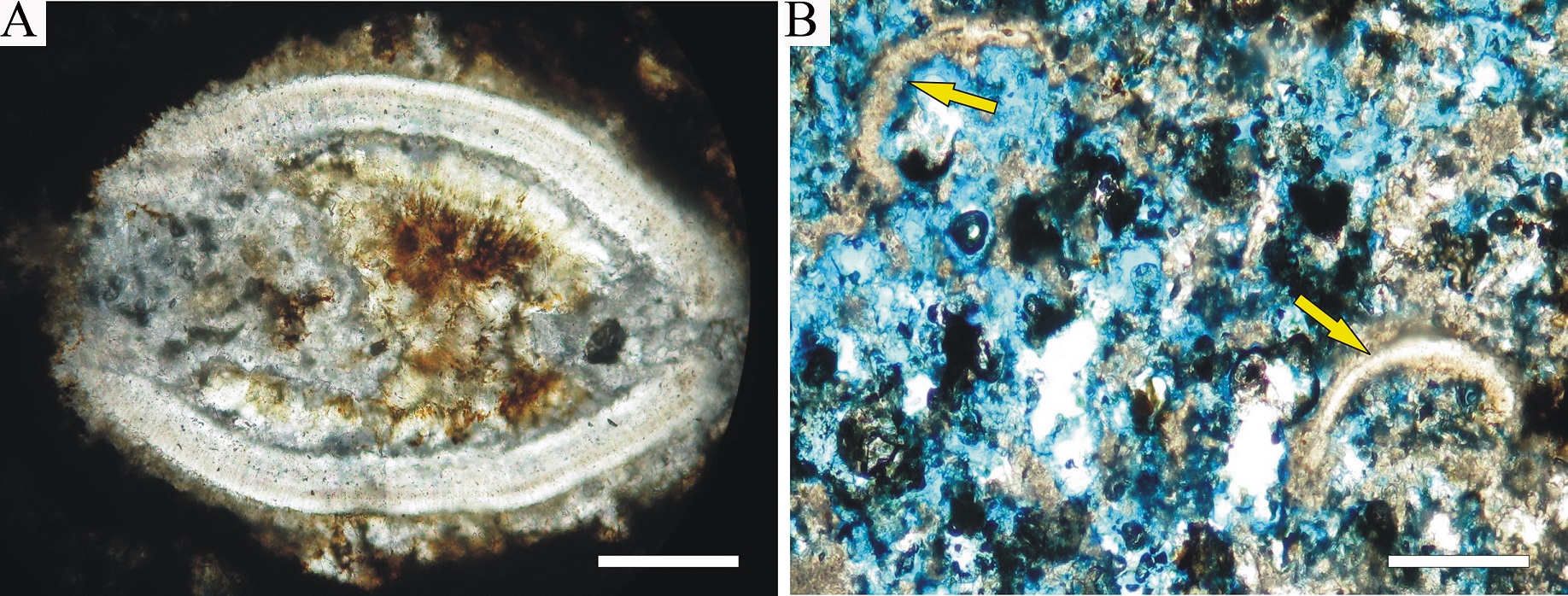Asimismo, en los estromatolitos maastrichtianos de la Cuenca del Golfo San Jorge no se observan intercalaciones epiclásticas entre la laminación como fue documentado por Cabaleri y Armella (2005) en las estructuras estromatolíticas jurásicas estudiadas en la Formación Cañadón Asfalto. Estos autores interpretaron la presencia de wackes como respuesta a cambios climáticos estacionales que influyeron en la sedimentación durante una etapa de alto nivel de lago y bajo condiciones climáticas subáridas cálidas (Cabaleri y Armella, 1999, 2003). La ausencia de elementos epiclásticos y de brechas singenéticas dentro del estromatolito E1, se ajusta con lo propuesto para la formación de estas geometrías dómicas actualmente restringidas a zonas protegidas y poco agitadas (Mas y Alonso, 1992). Además, sugiere una dominancia de la meteorización química sobre la mecánica (Marchese, 1974), la que prevalece bajo condiciones de climas tropicales (Scasso y Limarino, 1997) a diferencia de la mecánica que lo hace en condiciones de aridez. Condiciones similares fueron documentadas por Vallati et al. (2016) a través de estudios palinológicos, específicamente en el sitio de procedencia del E1. Dicha palinoflora incluye palinomorfos conspicuos de la región paleotropical (Buttinia andreevi Boltenhagen, 1967 y Gabonisporis vigourouxii Boltenhagen, 1967) junto a otros palinomorfos representativos de ambientes húmedos y cálidos. A favor de esta interpretación se han reconocido en secciones delgadas al microscopio petrográfico, restos de ostrácodos articulados y valvas desarticuladas no fragmentadas incluidas entre la laminación del E1 (Fig. 5), y la ausencia hasta el momento de bioestructuras asociadas con aguas agitadas como oncolitos (Aguirre-Urreta et al., 2011).
