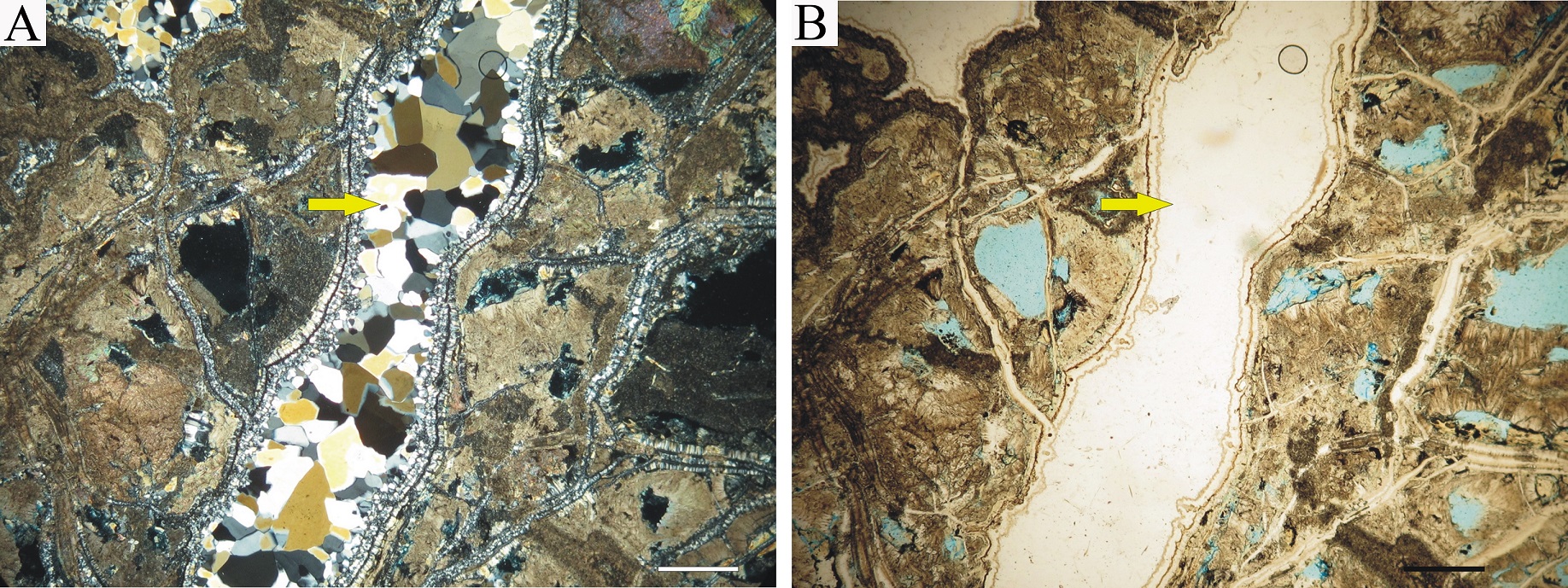 FIG. 8. Sección delgada del estromatolito E1 vista al microscopio petrográfico donde se observan venillas con cuarzo (flecha amarilla). A. A nicoles cruzados. B. A nicoles paralelos. Escala: 1 mm.