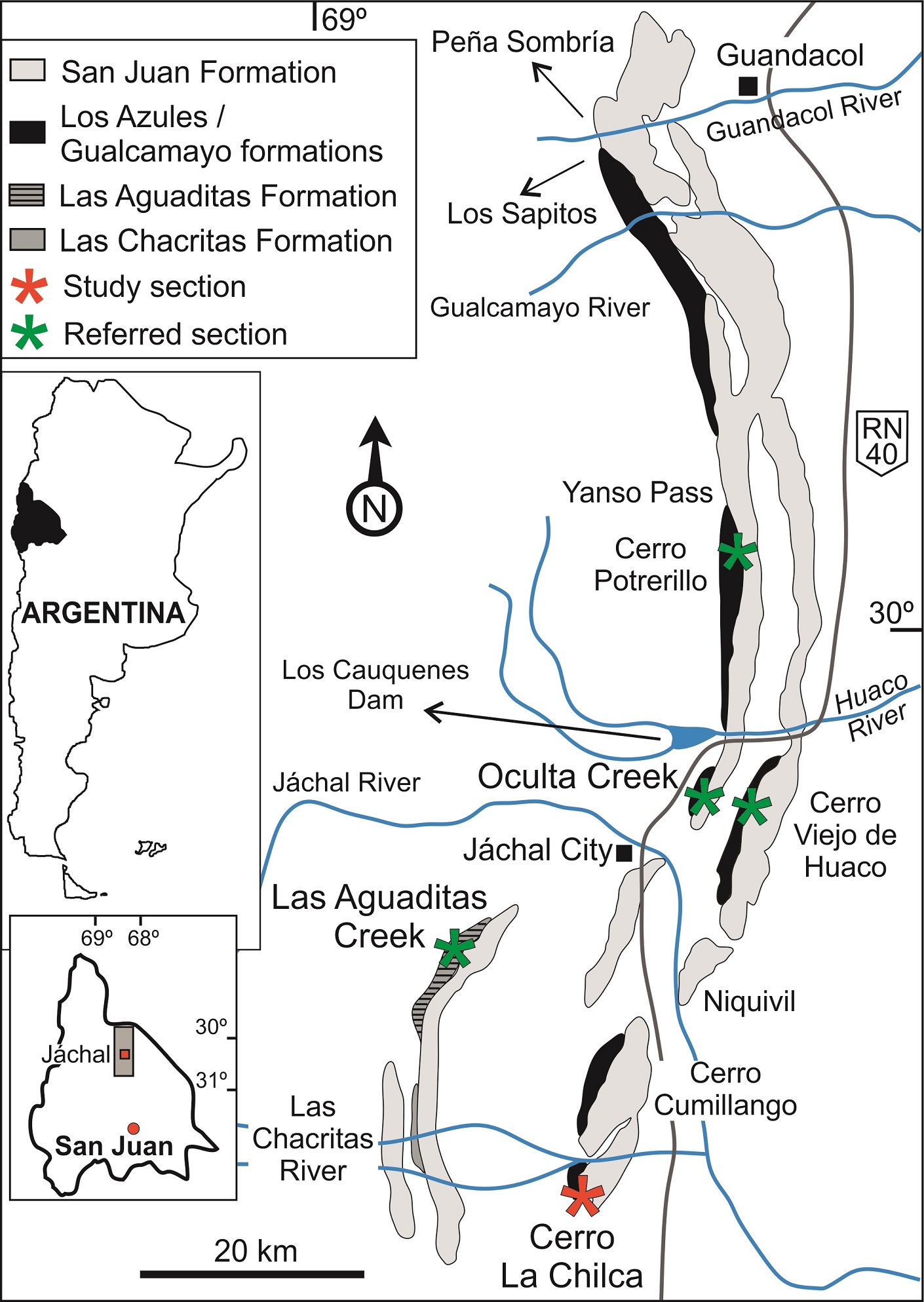 The Ordovician succession that crops out in this area consists of the San Juan (upper Tremadocian-lower Darriwilian), Gualcamayo (middle Darriwilian), Los Azules (lower Sandbian) and Don Braulio (Hirnantian) formations (Baldis et al., 1982; Peralta, 2003). These units are successively overlain by the La Chilca and Los Espejos formations of mostly Silurian age (Cuerda, 1969) and the Talacasto (Padula et al., 1967) and Punta Negra (Bracaccini, 1950) formations of Devonian age (Cuerda and Furque, 1985; Cuerda, 1986; Astini and Benedetto, 1992).