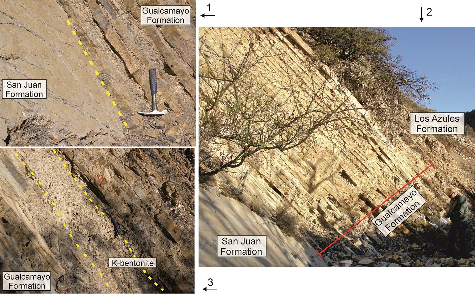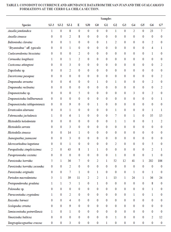 In the upper part of the San Juan Formation and the overlying Gualcamayo Formation, Mestre (2012) documented the presence of Eoplacognathus pseudoplanus (Viira), Histiodella kristinae (Stouge) and Microzarkodina sp. cf. M. ozarkodella (Lindström), suggesting the presence of the upper E. pseudoplanus Zone in the contact between these formations. The identification of the E. pseudoplanus Zone at the top of the San Juan Formation at Cerro La Chilca has been questioned by recent studies (Carrera et al., 2013; Serra et al., 2017), which revise the age according to the presence of H. sinuousa.