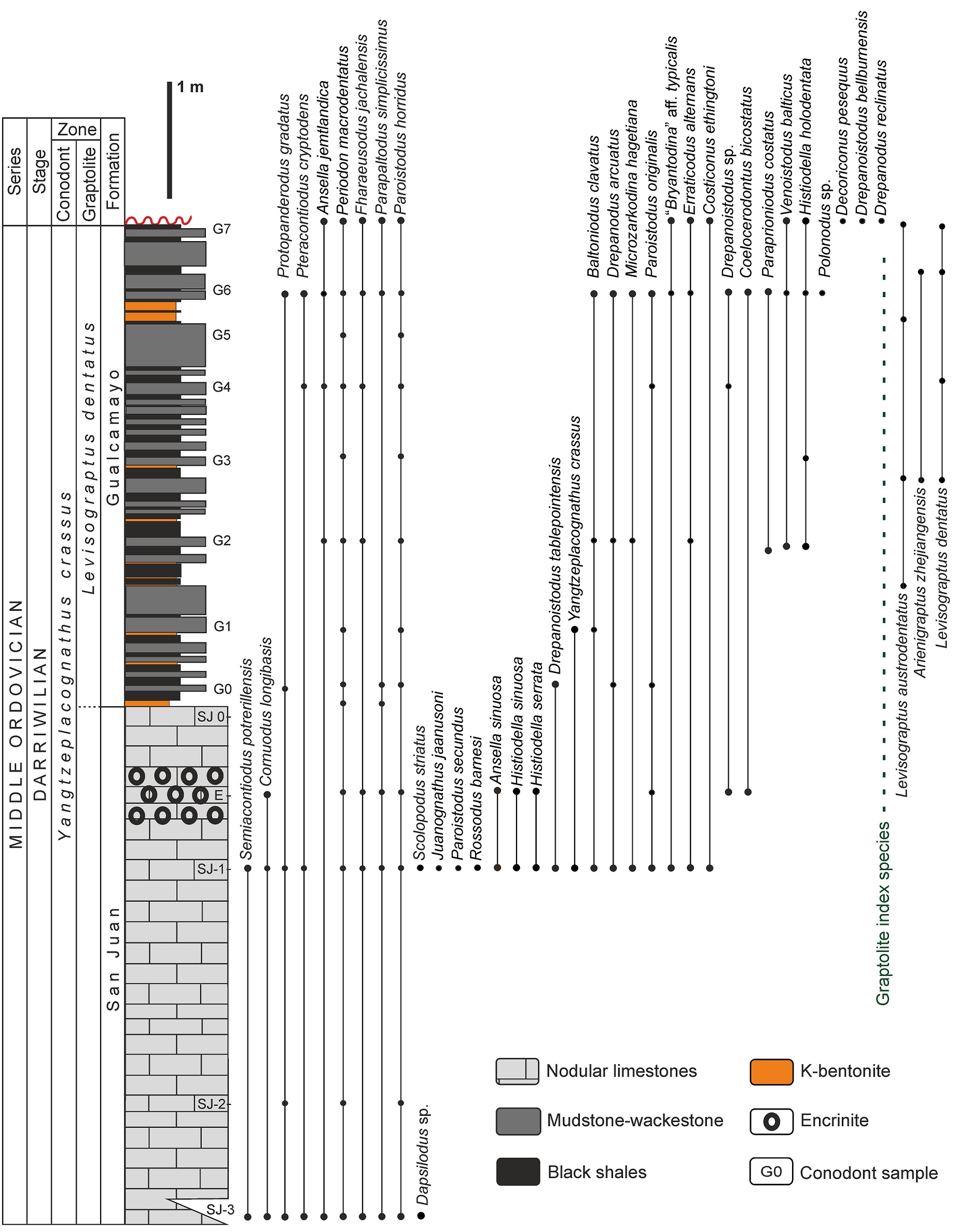 Our sample SJ-1 (ca. 1.6 m below the top of the San Juan Formation, see Fig. 3) yielded conodont elements of P. horridus secundus (Fig. 5.10), which would indicate the P. horridus Subzone of the L. variabilis Zone of the Argentine general conodont biozonation, as previously suggested by Carrera et al. (2013) and Feltes et al. (2016), and finally revised by Albanesi and Ortega (2016). Although, the co-occurrence of P. horridus horridus with Y. crassus in the same sample indicates the base of the Y. crassus Zone instead. Also, Pa elements of Y. crassus are found with H. sinuosa in this sample and in the subsequent one (1 m below the top of the San Juan Formation). The latter species is not reported, elsewhere, for the E. pseudoplanus Zone. The rich conodont association including index species such as Y. crassus, M. hagetiana, H. sinuosa, H. holodentata and P. macrodentatus, accompanied by the key graptolite species L. dentatus (Figs. 3, 7), verify the actual recognition of the Y. crassus Zone for the upper part of the San Juan Formation and the Gualcamayo Formation in the study section.