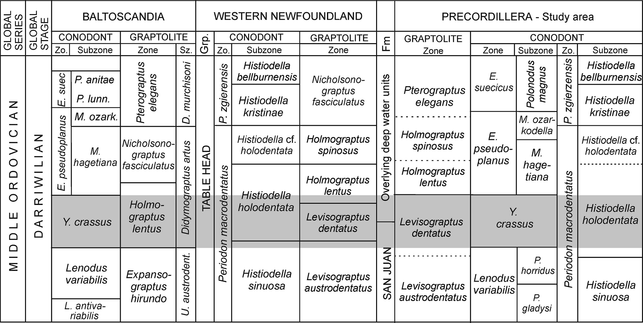 FIG. 6. Biostratigraphic chart of the Middle-Upper Ordovician showing conodont and graptolite zones from Baltoscandia (modified from Löfgren and Zhang, 2003), Western Newfoundland (modified from Stouge, 2012; Maletz, 2009, 2011), Argentine Precordillera (adapted from Feltes et al., 2016; Albanesi and Ortega, 2016 and Serra et al., 2017). Abbreviations: Zo.: Zone; Sz.: Subzone; Grp.: Group; E. suec.:E. suecicus; P. lunn.:P. lunnensis; L. austrodent.: L. austrodentatus.