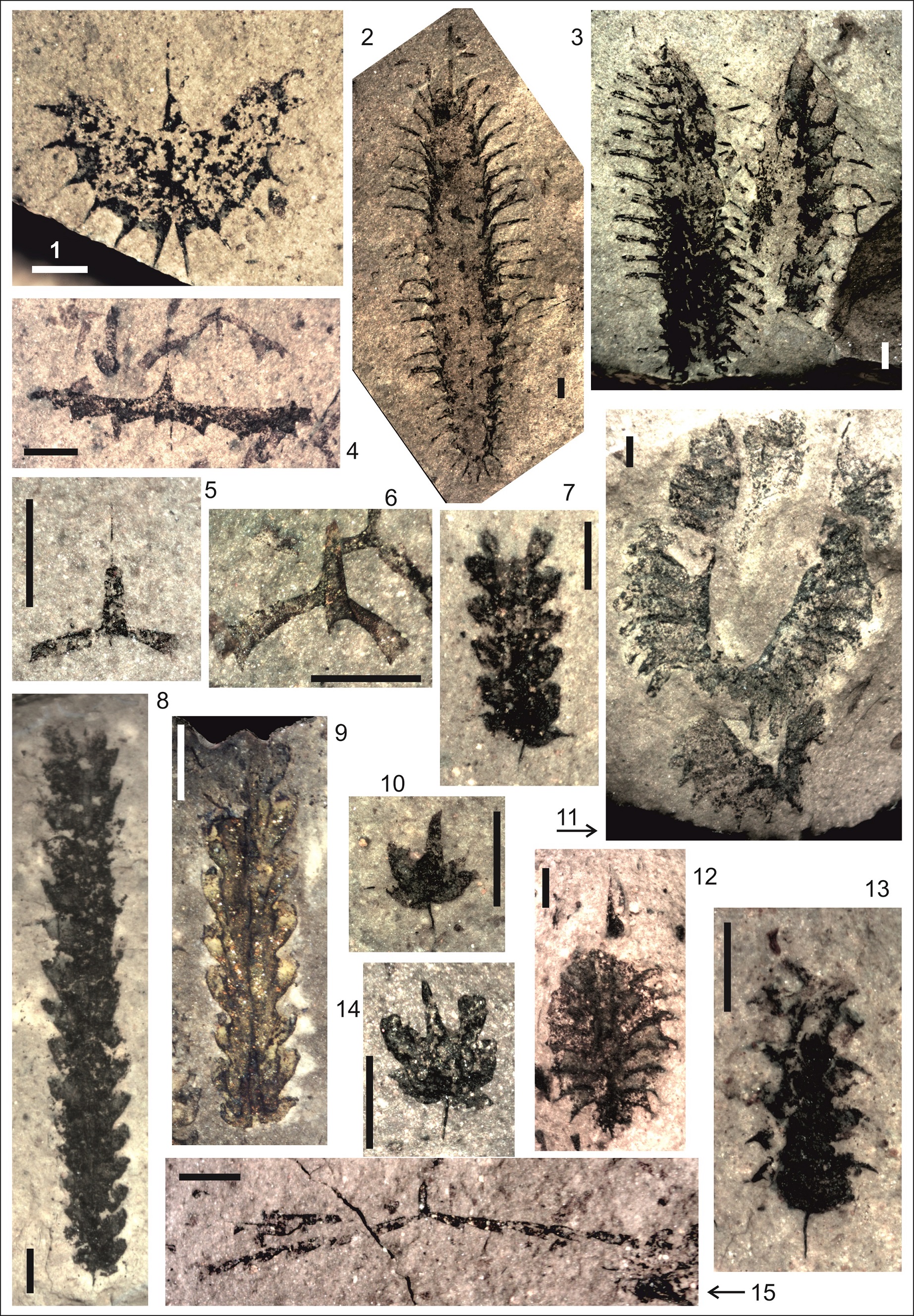 FIG. 7. Graptolites from the Gualcamayo Formation at the Cerro La Chilca section. 1.Arienigraptus zhejiangensis (Yu and Fang), sample G4, CORD-PZ 25778. 2-3. Paraglossograptus tentaculatus Hall; 2. Sample Gf4 (see Serra et al., 2017), CORD-PZ 22272; 3. Sample G4, CORD-PZ 25779; 4.Xiphograptus lofuensis Lee, sample G7, CORD-PZ 22458; 5, 15. Holmograptus bovis Williams and Stevens, sample G75; 5. CORD-PZ 22459; 15.CORD-PZ 25728. 6.Pseudobryograptus parallelus Mu, sample G3, CORD-PZ 25777; 7-8. Levisograptus dentatus (Brongniart), k-bentonite strata between samples G5 and G6 (sample Gf7 in Serra et al., 2017); 7. CORD-PZ 22361; 8. CORD-PZ 22354. 9. Levisograptus austrodentatus (Harris and Keble), k-bentonite strata between samples G5 and G6 (sample Gf7 in Serra et al., 2017), CORD-PZ 22443; 10, 14. Levisograptus sp. 10. k-bentonite strata between samples G5 and G6 (sample Gf7 in Serra et al., 2017), CORD-PZ 22384; 14. Sample G7, CORD-PZ 22456; 11. Tetragraptus bigsbyi (Hall), sample Gf4 (see Serra et al., 2017), CORD-PZ 25778. 12. Pseudophyllograptus sp. Sample Gf2 (see Serra et al., 2017), CORD-PZ 22221. 13. Levisograptus sinicus Mu and Lee, k-bentonite strata between samples G5 and G6 (sample Gf7 in Serra et al., 2017), CORD-PZ 22328. Scale bar: 1 mm.
