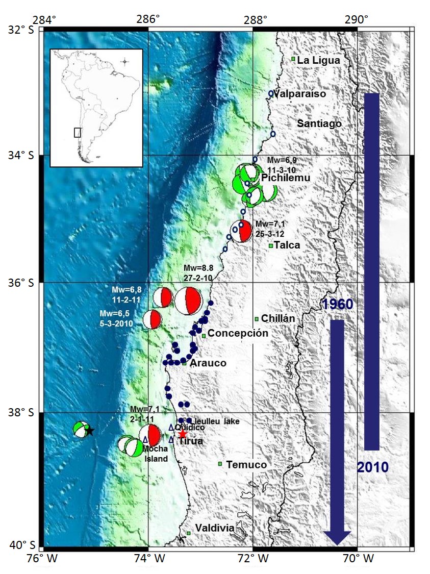 A strong Mw=7.1 aftershock, with epicentre in the Tirúa-Mocha Island area, occurred on January 2nd 2011 (Araucanía 2011 earthquake) showing a reverse focal mechanism (Moreno et al., 2011; Kiser and Ishii, 2013, Fig. 1). This event was one of greatest aftershocks of Maule 2010 earthquake. National Earthquake Information Center (NEIC) located this event at 38.35° S/73.27° W (13 km from the southern coast of Lleulleu Lake) and 25.1 km depth, thrust focal mechanism with rupture plane N4°E/16°E corresponding to Wadati-Benioff. The Centro Sismológico Nacional (National Seismological Centre of Chile, of Universidad de Chile, CSN), located this event at 38.36° S/75.03° W (15 km west of the trench axis at Mocha Island latitude) and at 32.1 km depth (Fig 1). The Araucanía 2011 earthquake was relocated by CSN on September 2012. The new coordinates for the epicentre are 38.343° S/73.961° W and de new depth was 17.8 km. This location coincides with the NW tip of Mocha Island, 87 km east to the trench axis. Hicks and Rietbrock (2015) studied in detail this earthquake concluding that this event is composed of two ruptures on two separate faults. Within 12 s a thrust earthquake on the plate interface triggered a second large rupture on a normal fault 30 km away in the overriding plate. Two locations of the epicentre they displayed: 38.47° S/73.82° W at 39 km depth and 38.54° S/73.73° W at 23 km depth (both locations lies between Tirúa and Mocha Island). Also the epicentre of this event is displayed by the GFZ-GEOFON: 38.23° S/72.33° W at 12 km depth (This location lies in the coast zone near Quidico).