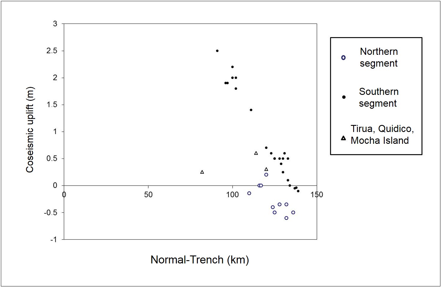 Fig. 2. Vertical coseismic ground movements trend for Maule 2010 earthquake. Northern segment: points from 33° S-35.5° S, southern segment points from 36° S-38.2° S, data from Quezada et al. (2010) location is showed in figure 1. The different normal trench distance of cero uplift in both segments indicates the shallower rupture of northern segment. The anomalous behavior of of Tirúa-Mocha Island and Quidico area (two points, one is the same of Tirúa, the other is the rock located 2.2 km north Quidico), is shown by a lesser surface uplift at Mocha Island than Tirúa.