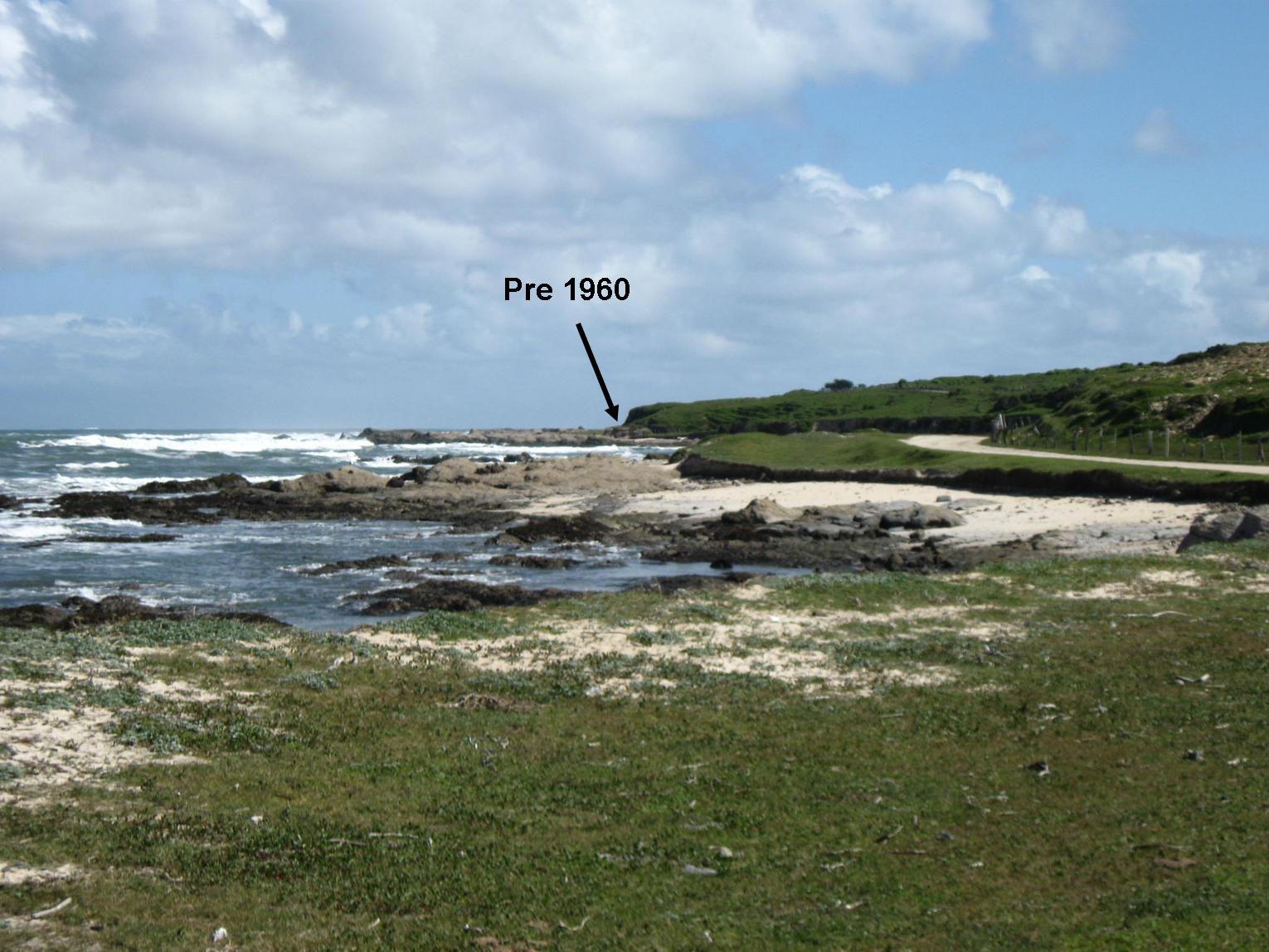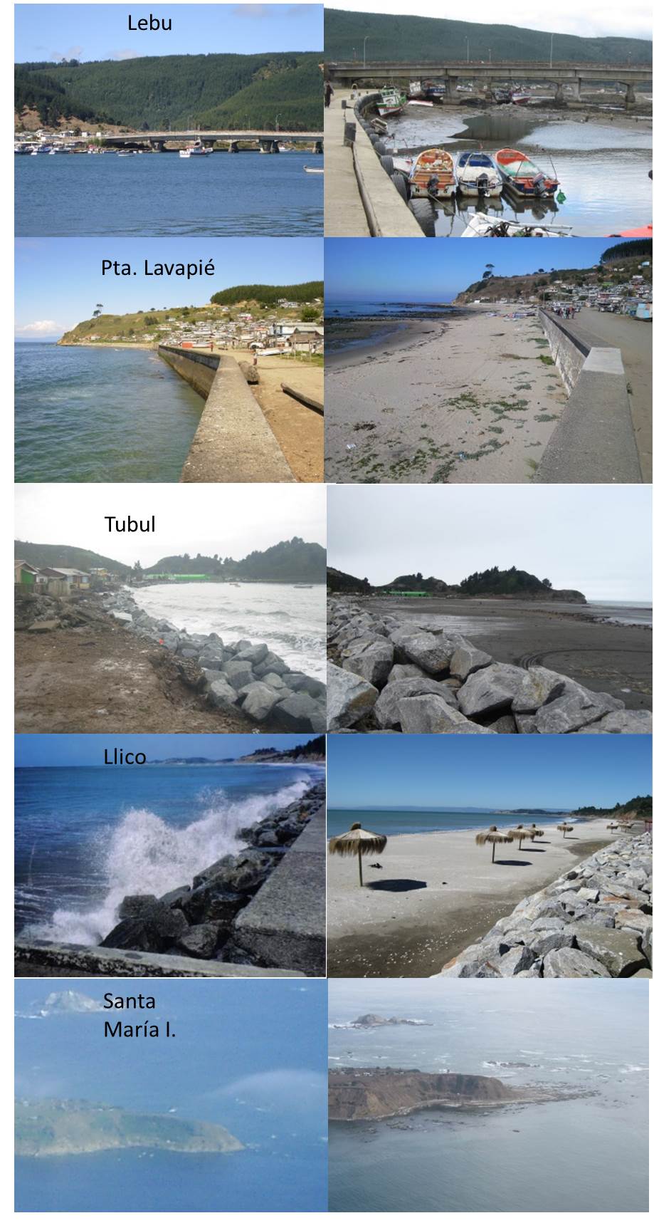 Lebu underwent a coseismic ground uplift of 1.2-1.3 m during the Valdivia 1960 earthquake (Veyl, 1960; Saint Amand, 1961; Plafker and Savage, 1970). As a result Lebu river mouth dried out and the marine abrasion platform emerged (Figs. 4 and 5). This 1960 surface uplift was reversed in the 50 years between Valdivia 1960 and Maule 2010 earthquakes, so the marine platform became submerged and Lebu river mouth was navigable again (Fig. 5). The relative increase in sea level occurred during the interseismic 1960-2010 interval, in Santa María Island and the western border of Arauco Peninsula, caused several morphologic changes with consequences in the anthropic activity (Quezada et al., 2012, Figs. 4 and 5). The coastal cliff became active and the beaches narrower. In Tubul, Llico and Punta Lavapié (NW tip of Arauco Peninsula, (Fig. 3), the sea level increase generated that houses closer to the coast line were threatened, especially during winter storms, having forced the construction of a breakwater (Fig. 4). In Lebu, Punta Lavapié, Tubul and Llico the navigation was facilitated. 1960 coseismic ground uplift occurred also in Caleta Yani (37.36°, Fig. 3): 0.7 m (Veyl, 1960) that also was recovered before 2010 Maule earthquake. On the contrary, the 1.5-1.8 m coseismic uplift in Mocha Island during the 1960 earthquake that produced the emersion of the marine abrasion platform, making possible the construction of a way that encircled the island, remained until the occurrence of Maule 2010 earthquake, as we could corroborate during our first trip to Mocha Island on November 6-7th 2009 (Fig. 6). Before the 1960 earthquake, a dock was planned to build in Mocha Island. The construction began after this quake and was not considered in the original topographic map built before the 1960 earthquake, the coseismic uplift that generated a sea level drop, so once the dock was ended, it became useless. We saw this dock in November 6th 2009 remaining dry.